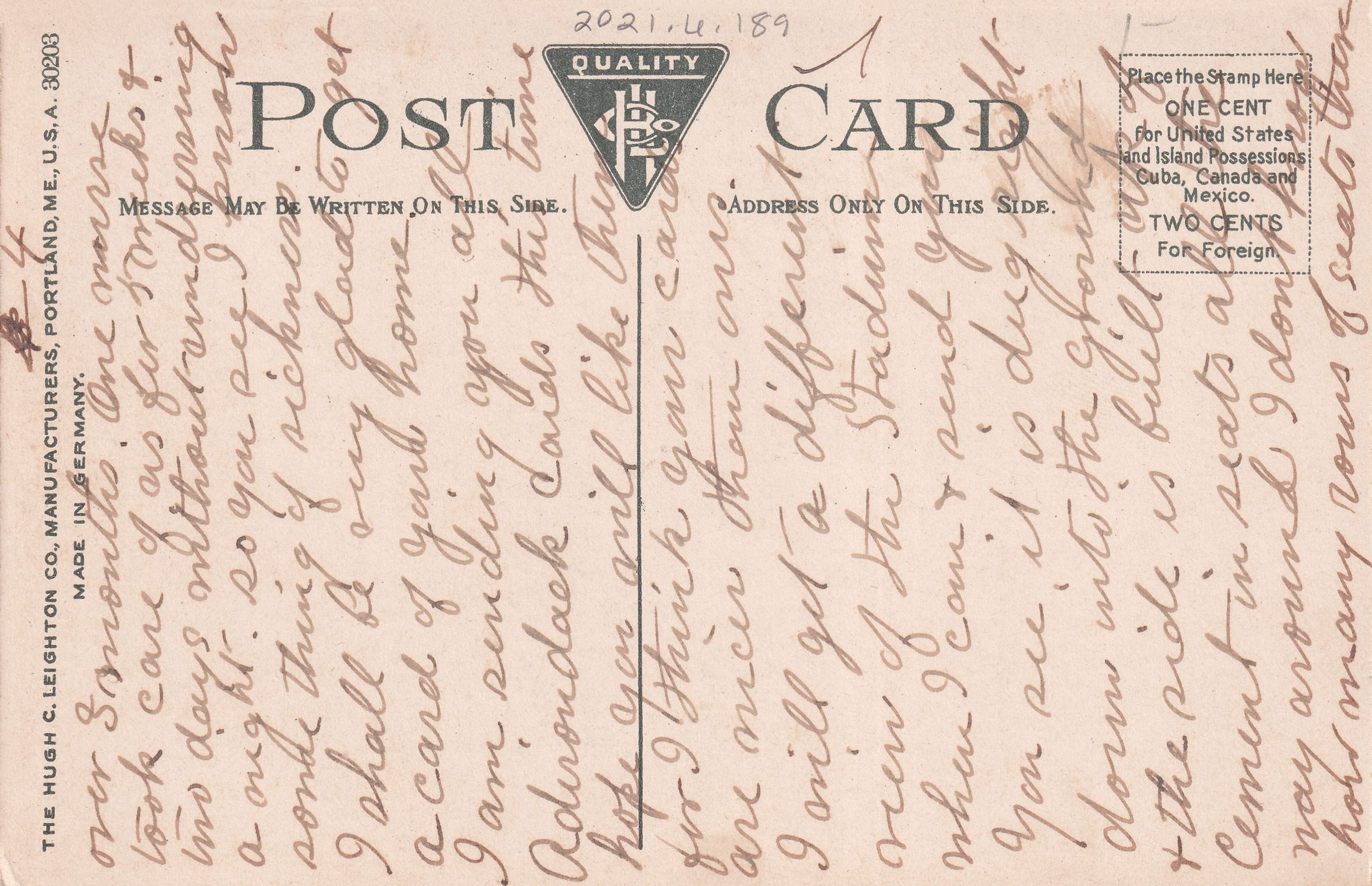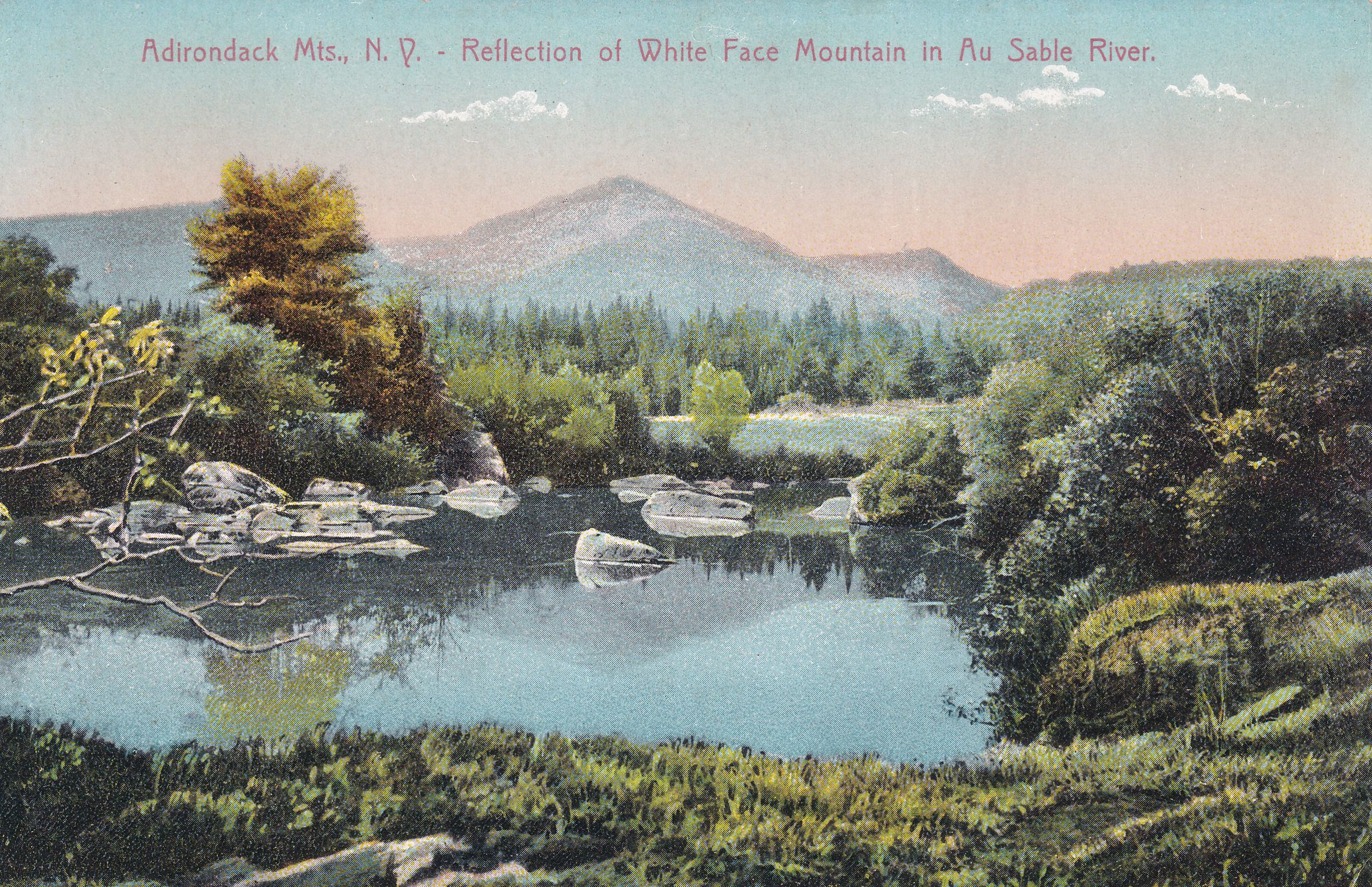 Color postcard showing the Au Sable River with Whiteface Mountain in the distance. Printed caption on front reads, "Adirondack Mts., N.Y. - Reflection of White Face Mountain in Au Sable River." Printed by the Hugh C. Leighton Co., Portland, ME. Used, divided back, not postmarked. Handwritten message across entire back of card reads, "...over 5 month. One nurse took care of us for 5 weeks & two days without [?] a night. So you see I know something of sickness. I shall be very glad to get a card of your home. I am sending you all Adirondack cards this time. Hope you will like them for I think your cards are nicer than ours. I will get a different view view of the Stadium when I can & send you. You see it is dug right down into the ground & the side is built up of Cement in seats all the way around. I don't know how many rows of seats there..." Not mailed.Lexicon