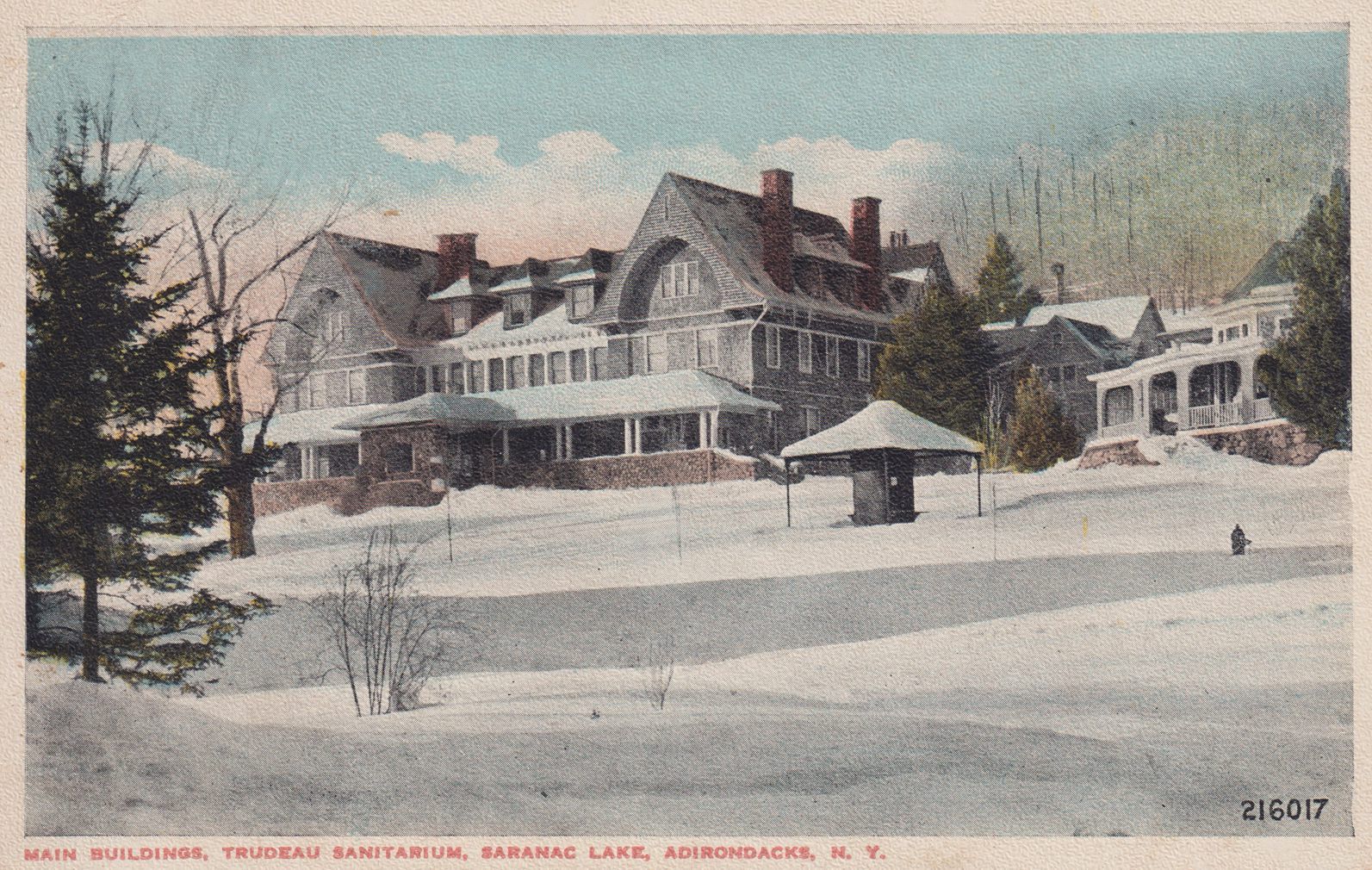 Color postcard showing the Main Building at Trudeau Sanatorium in the snow. Printed caption on front reads, "Main Building, Trudeau Sanitarium, Saranac Lake, Adirondacks, N.Y." No printer's mark. Unused, divided back, white border.Subject Place