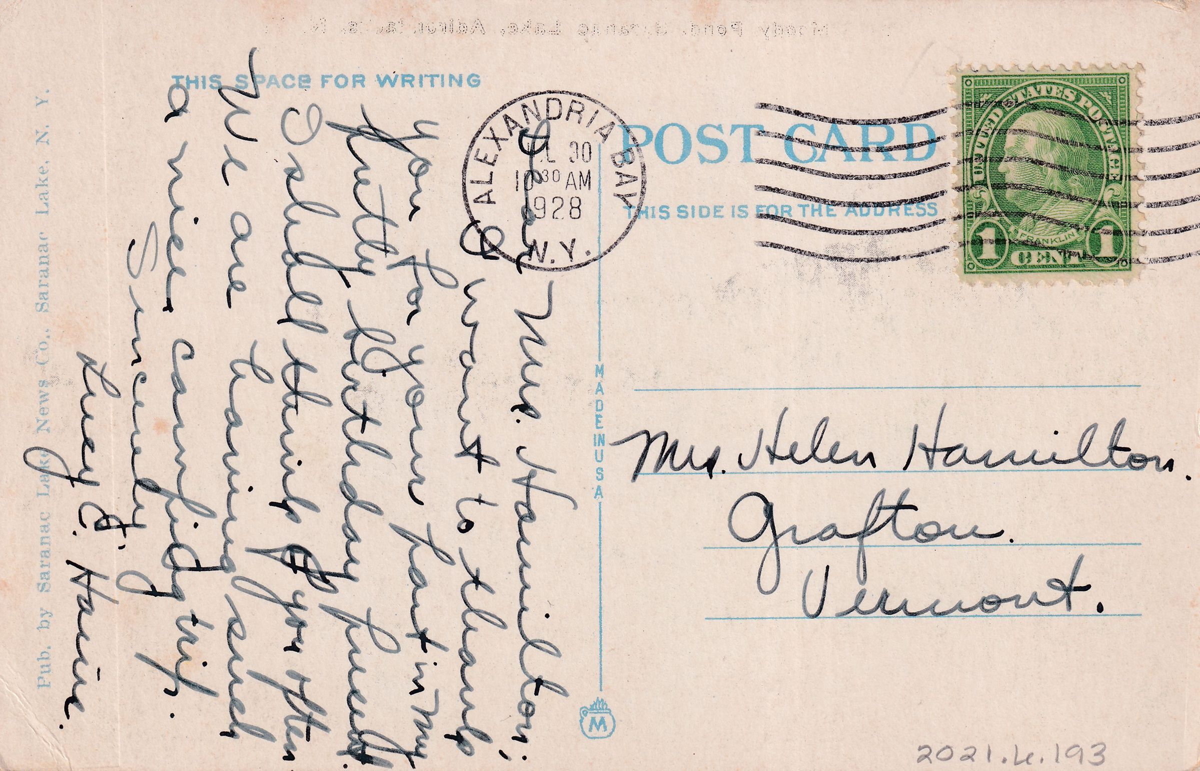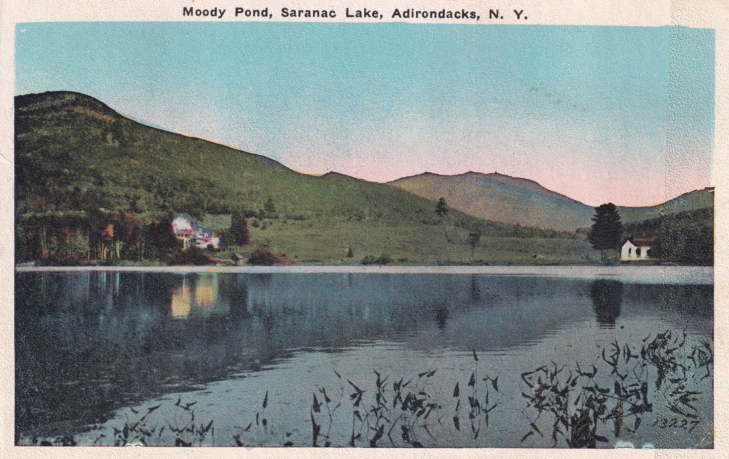 Color postcard showing the view across Moody Pond toward Mt. Baker. Two houses are visible on the opposite shore. The right-hand house may be 120 Forest Hill Avenue [272]. Printed caption on front reads, "Moody Pond, Saranac Lake, Adirondacks, N.Y." Printed by the Saranac Lake News Co., Saranac Lake. Used, divided back, white border, postmarked Alexandria Bay, NY, July 30, 1928. Handwritten message on back reads, "Dear Mrs. Hamilton: I want to thank you for your part in my pretty birthday present. I shall think of you often. We are having such a nice camping trip. Sincerely, Lucy C. Hains." Mailed to Mrs. Helen Hamilton, Grafton, Vermont.Subject Place