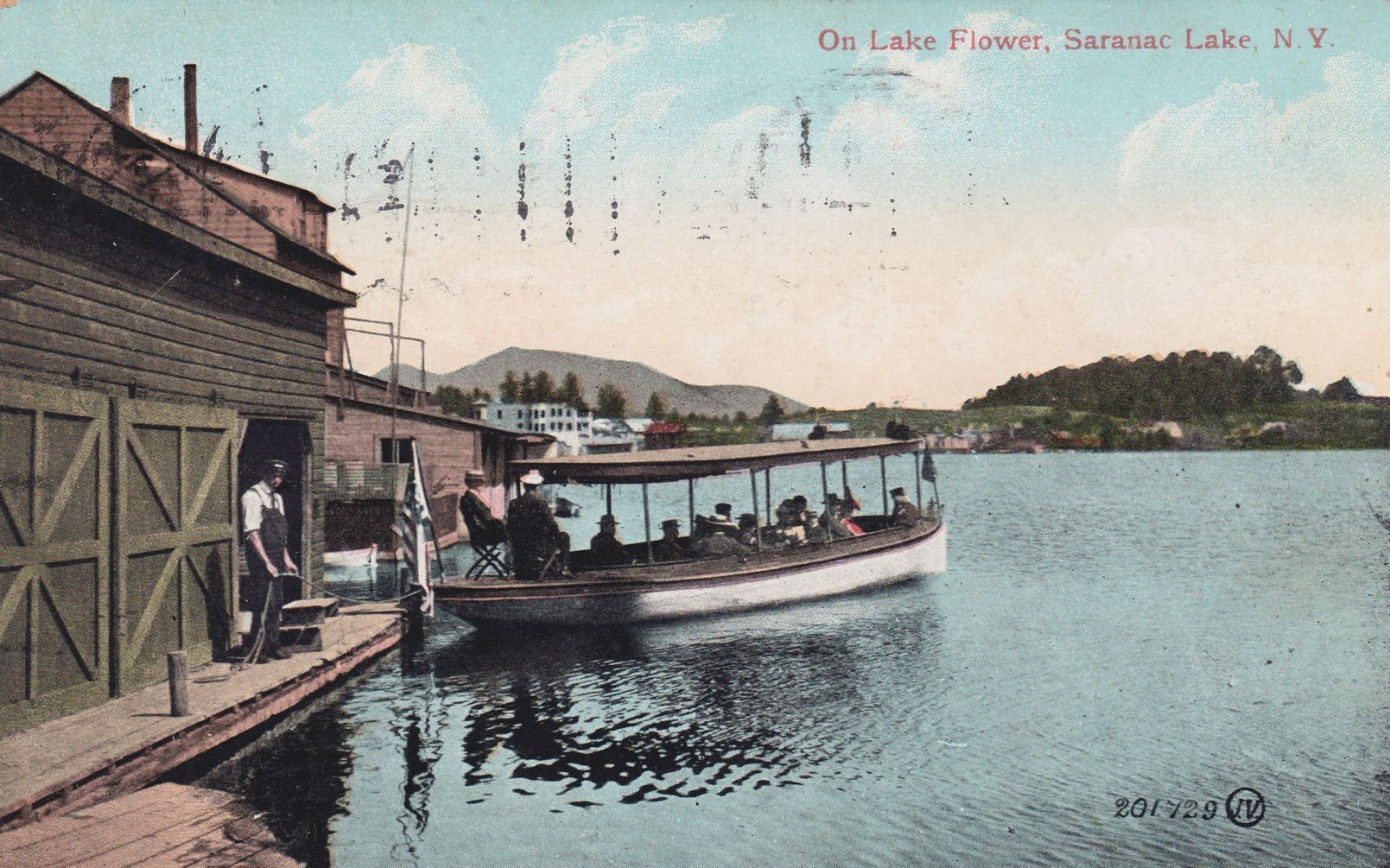 Color postcard showing a tour boat docking at a boathouse [possibly Thomas' Boat Lines]. Printed caption on front reads, "On Lake Flower, Saranac Lake, N. Y." Printed by the Valentine & Sons' Publishing Co., Ltd., New York. Used, divided back, postmarked Saranac Lake, December 7, 1910.