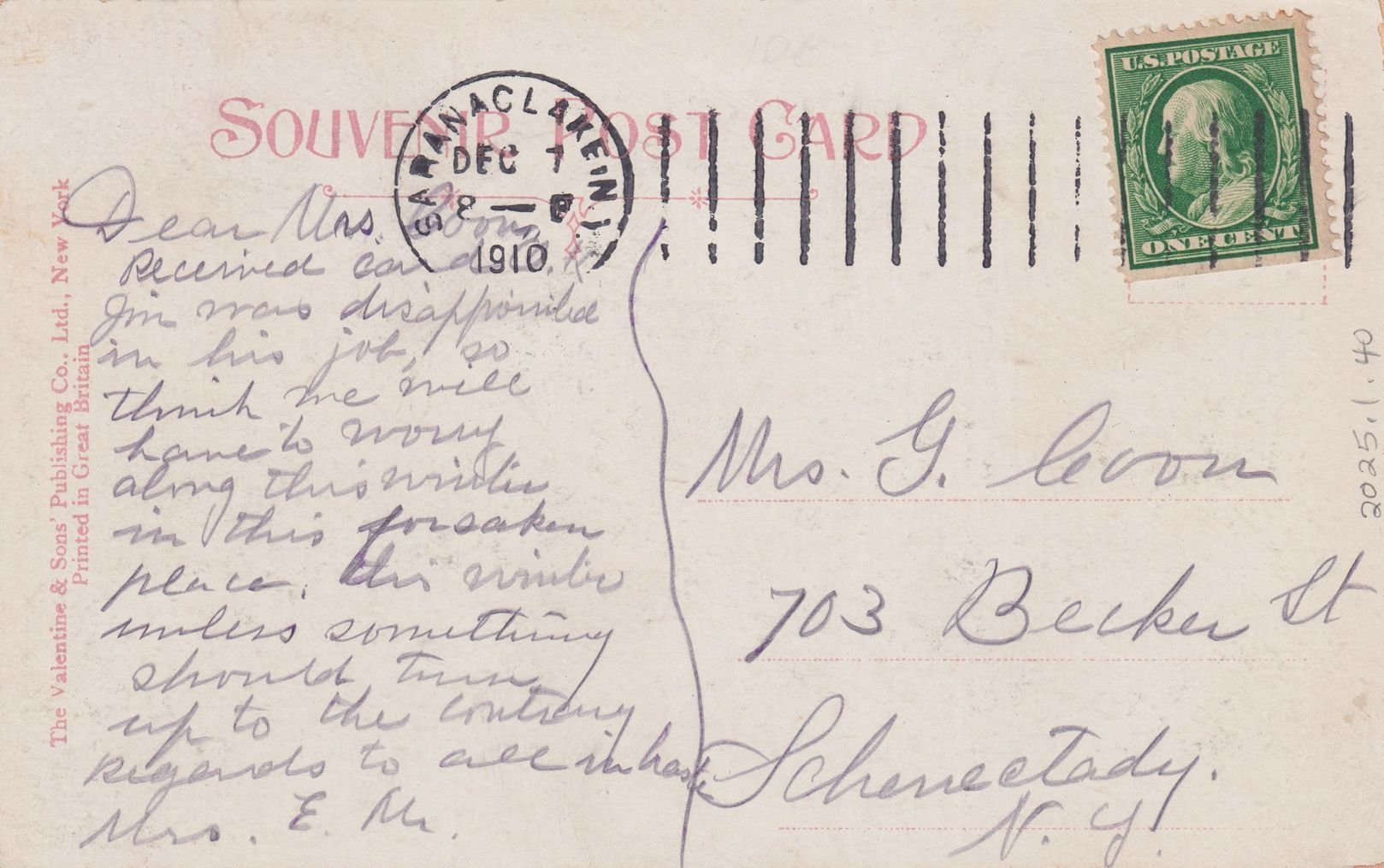 Handwritten note on reverse, "Dear Mrs. Coon [?], Received card O. K. Jim was disappointed in his job, so think we will have to worry along this winter in this forsaken place this winter unless something should turn up to the contrary. Regards to all in haste. Mrs. E. M." Mailed to Mrs. G. Coon [?], 703 Becker St., Schenectady, NY.Subject Place