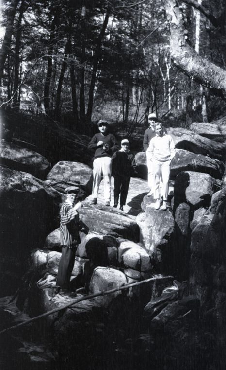Negative of five unidentified young men standing on rock formations in a forest. Most likely taken by Mary Ives Baldwin. This item is not fully cataloged but has been uploaded so the image is publicly available; if you would like us to prioritize cataloging this item, please contact the HSL Collections team.