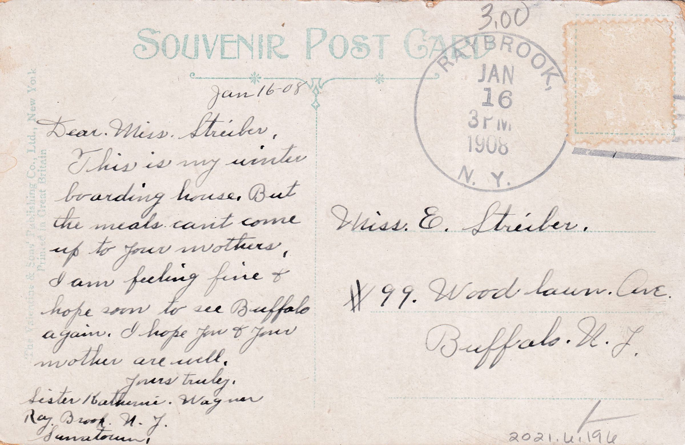 Color postcard showing the left-hand end of the main building at the New York State Hospital for Incipient Tuberculosis, AKA Ray Brook Sanatorium. The West and main wings are visible. Printed caption on front reads, "N. Y. State Sanatorium, Ray Brook, N. Y." Printed by the Valentine & Sons' Publishing Co., Ltd., New York. Used, divided back, postmarked January 16, 1908, Ray Brook, NY. Handwritten message on back reads, "Jan 16-08. Dear Miss Streiber, This is my winter boarding house. But the meals can't come up to your mother's. I am feeling fine & hope soon to see Buffalo again. I hope you & your mother are well. Yours Truly, Sister Katherine Wagner, Ray Brook, N. Y. Sanatorium." Mailed to Miss E. Streiber, #99 Woodlawn Ave., Buffalo, N. Y.Subject Place