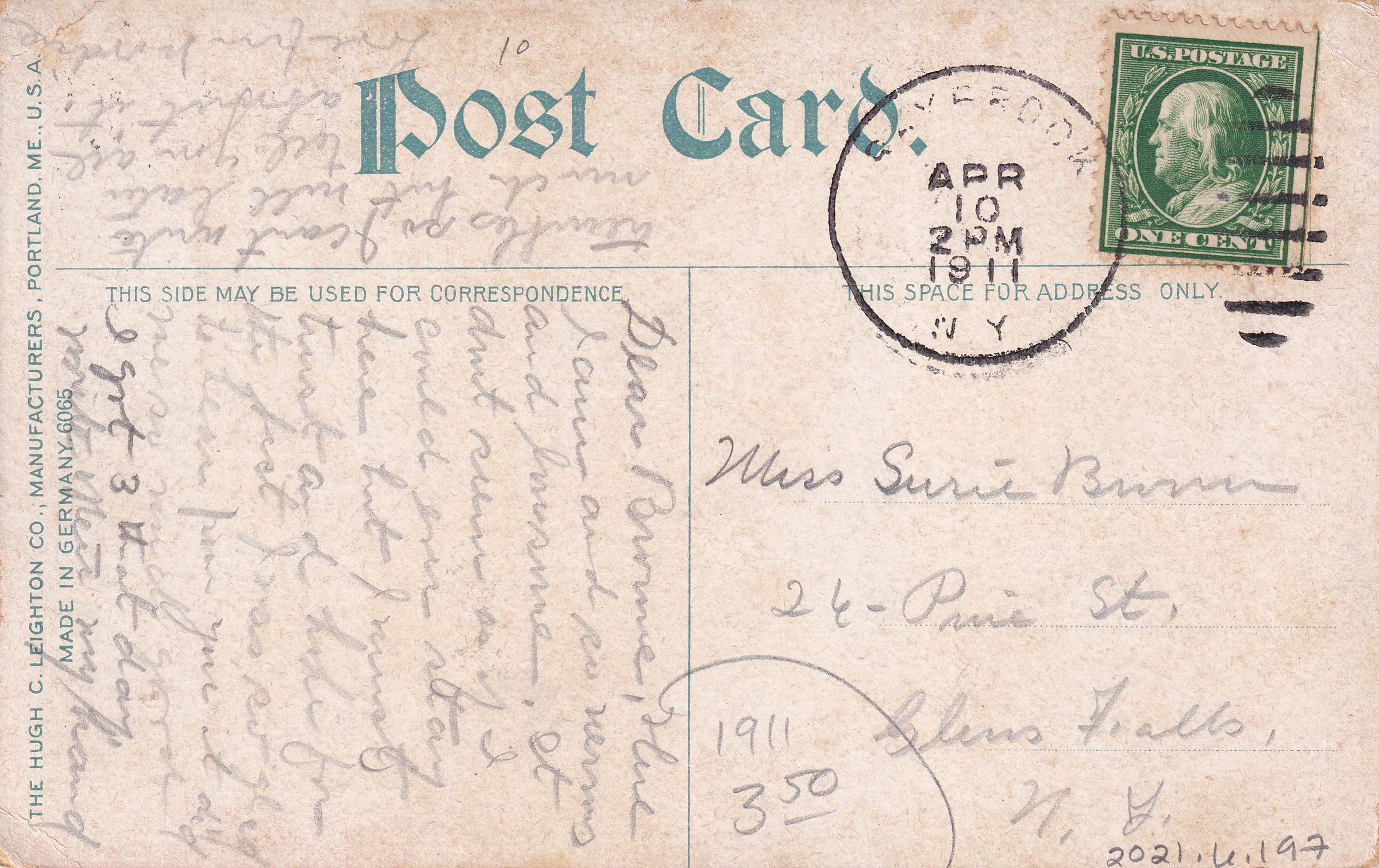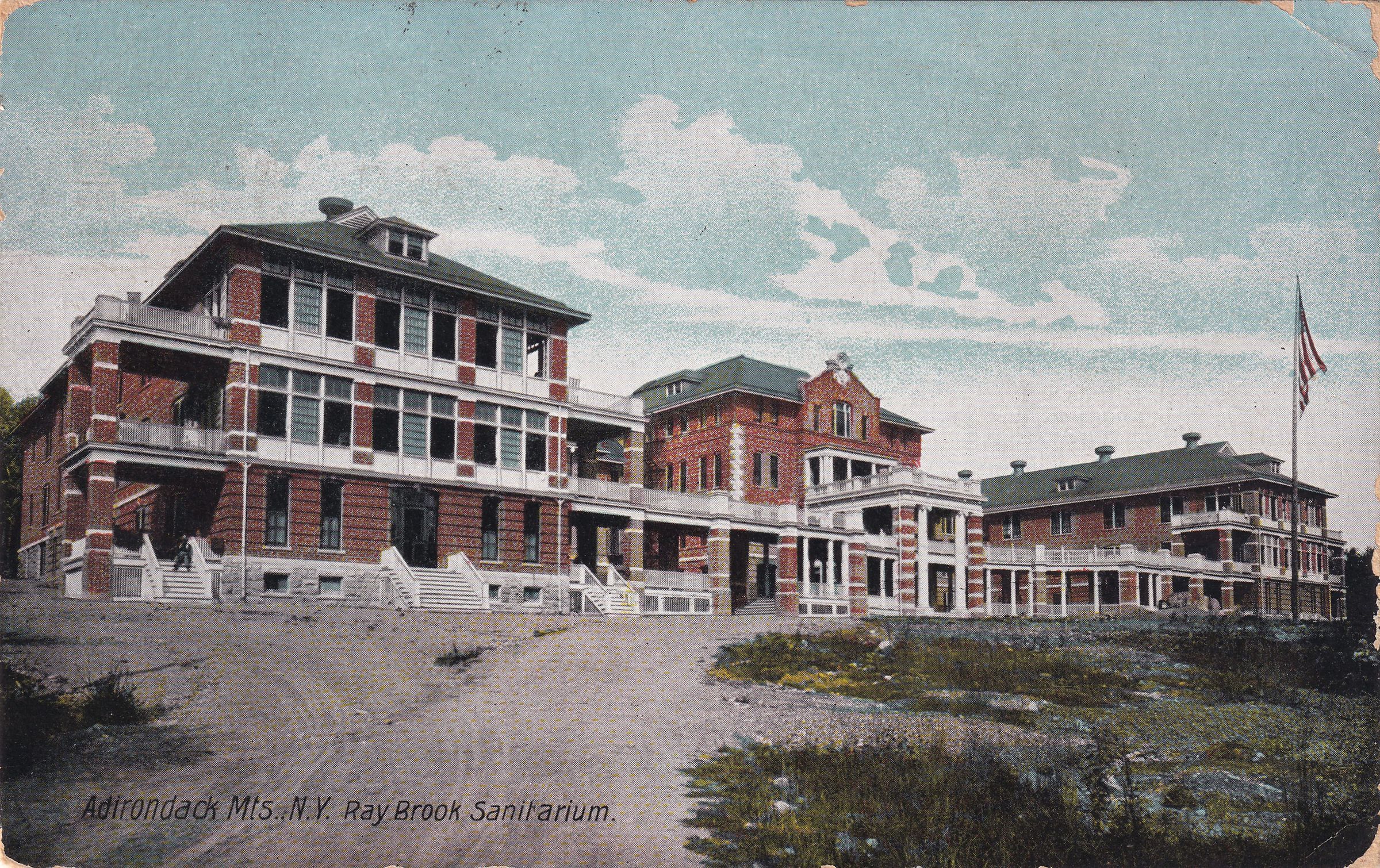 Color postcard showing the main building at the New York State Hospital for Incipient Tuberculosis, AKA Ray Brook Sanatorium. looking north. The West, Main, and East wings are visible. Printed caption on front reads, "Adirondack Mts., N. Y. Ray Brook Sanitarium." Printed by the Hugh C. Leighton Co., Portland, ME. Used, divided back, postmarked Ray Brook, NY, April 10, 1911. Handwritten message on back reads, "Dear Brownie, Here I am and so nervous and lonesome. It doesn't seem as if I could ever stay here but I must trust and hope for the best. I was so glad to hear from you it did me so much good. I got 3 that day. Write often. My hand trembles so I can't write much but will later. Tell you all about it. Love from [?]." Mailed to Miss Susie Brown, 26 Pine St., Glens Falls, NY.Subject Place