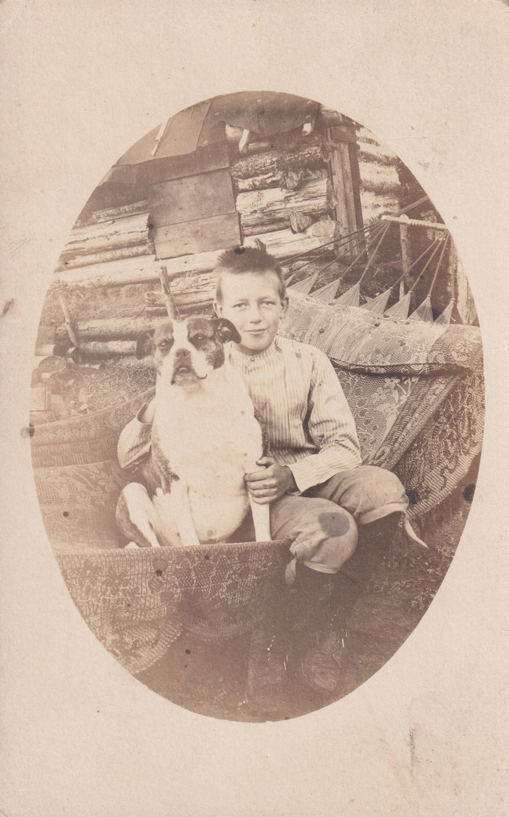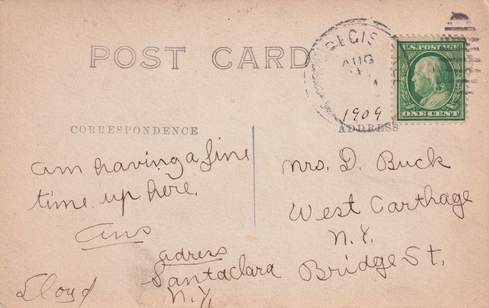 Photo postcard of a boy sitting on an outdoor hammock with a dog. The photo is framed in an oval shape. The postcard is addressed on the reverse to Mrs. D. Buck of Bridge St., West Carthage, N.Y. The message on the back, handwritten in pen, reads "Am having a fine time up here. An[?] Adress Santa Clara, N.Y." The postcard is dated 1909.