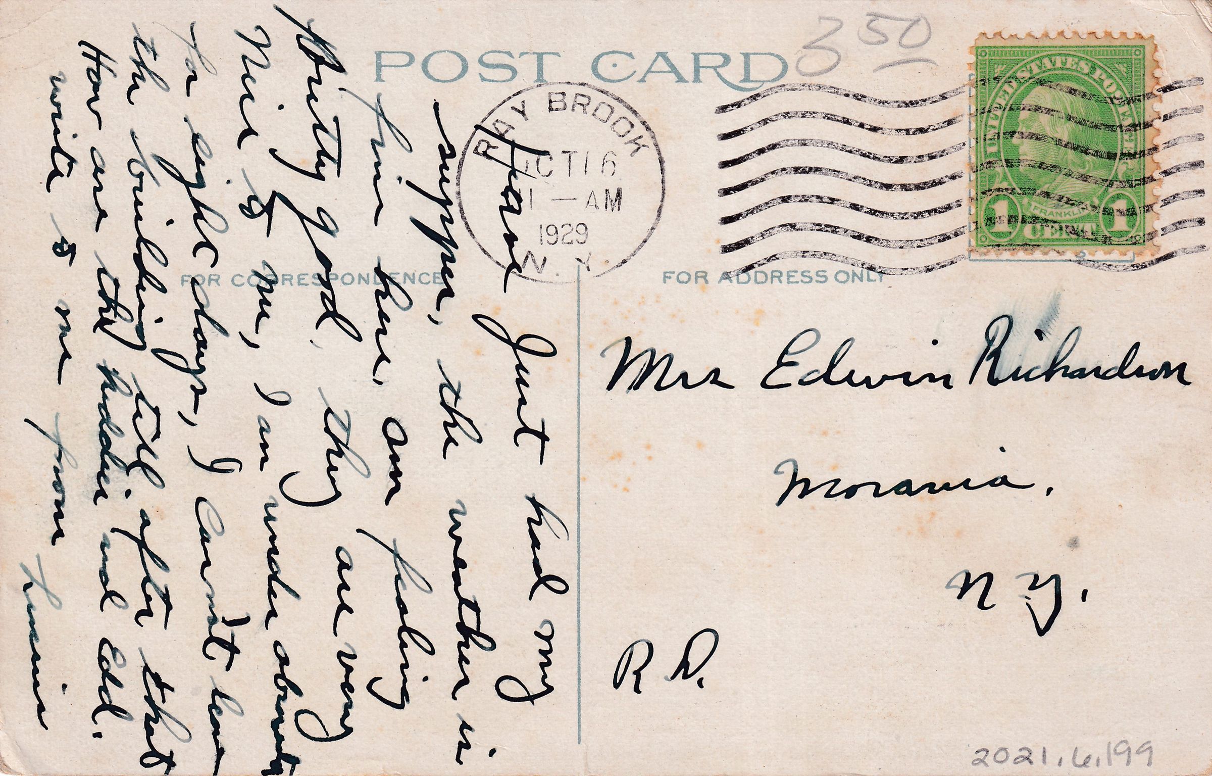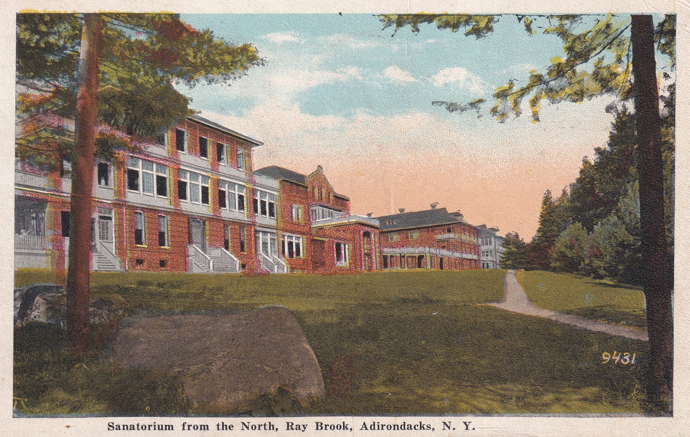 Color postcard showing the Main Building at the New York State Hospital for Incipient Tuberculosis, AKA Ray Brook Sanatorium. Printed caption on front reads, "Sanatorium from the North, Ray Brook, Adirondacks, N. Y." No printer's mark. Used, divided back, white border. Handwritten message on back reads, "Have just had my supper, the weather is fine here, am feeling pretty good, they are very nice to me, I am under observation for eight days, I can't leave the building till after that. How are the kiddies and Edd. Write to me. From, Lucius." Mailed to Mrs. Edwin Richardson, Moravia, NY. RD.Subject Place