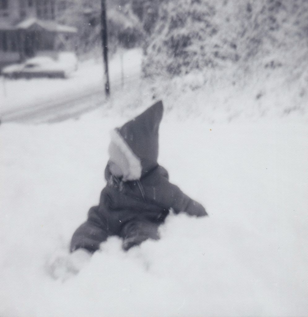 Black-and-White photograph of an infant Diane Winch [Furtaw] in the snow outside of 1 Woodycrest Road [53 Woodycrest Road] in the 1950s.