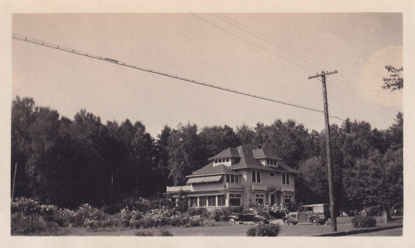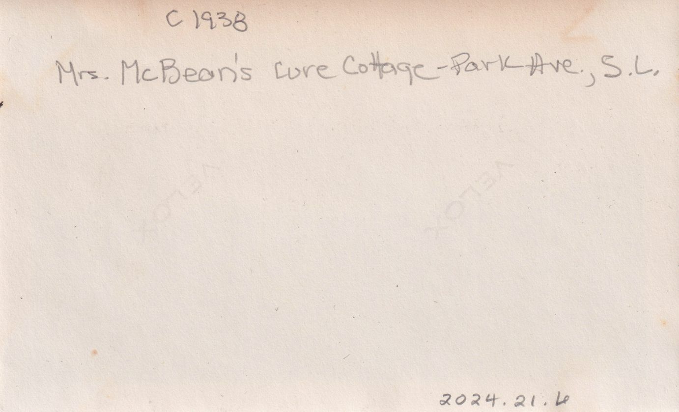 Black-and-White photograph of a cure cottage seen across the street. There are two cars parked in front, and gardens along the building. Handwritten caption on reverse reads, "c. 1938. Mrs. McBean's cure cottage - Park Ave., S.L."Photograph Details