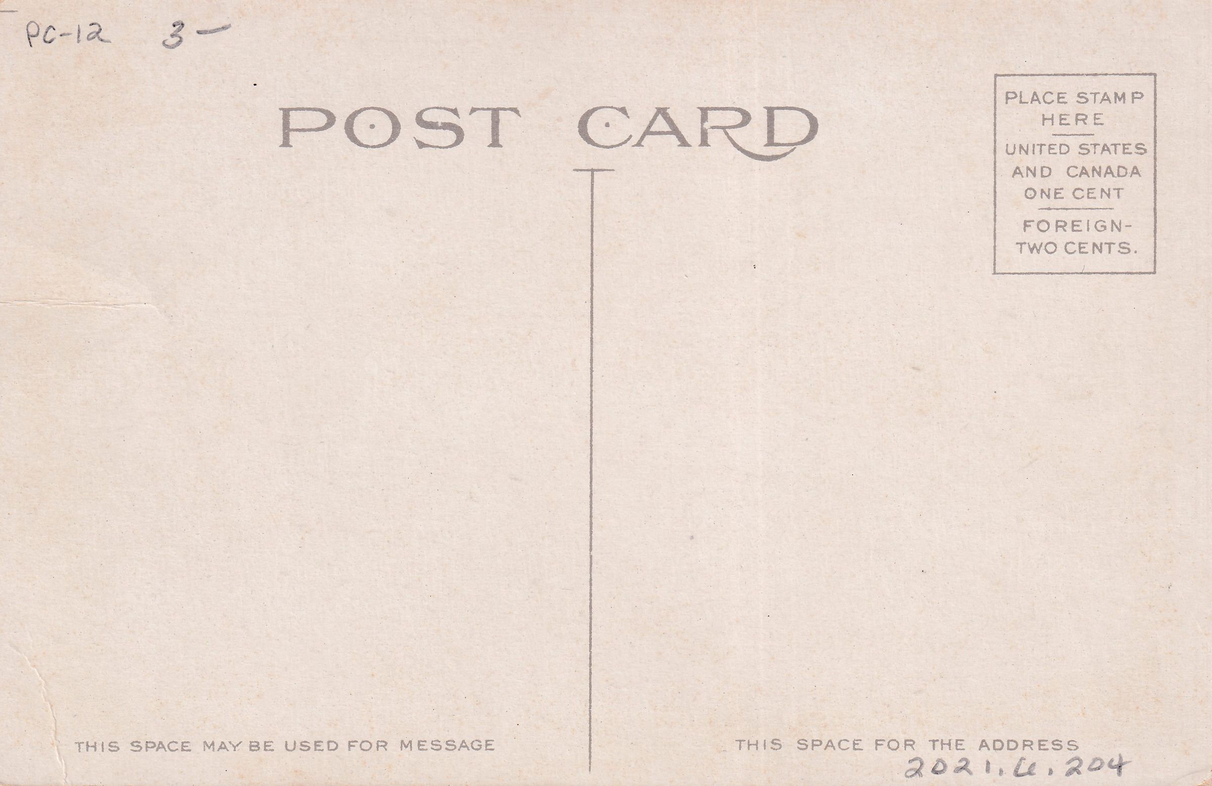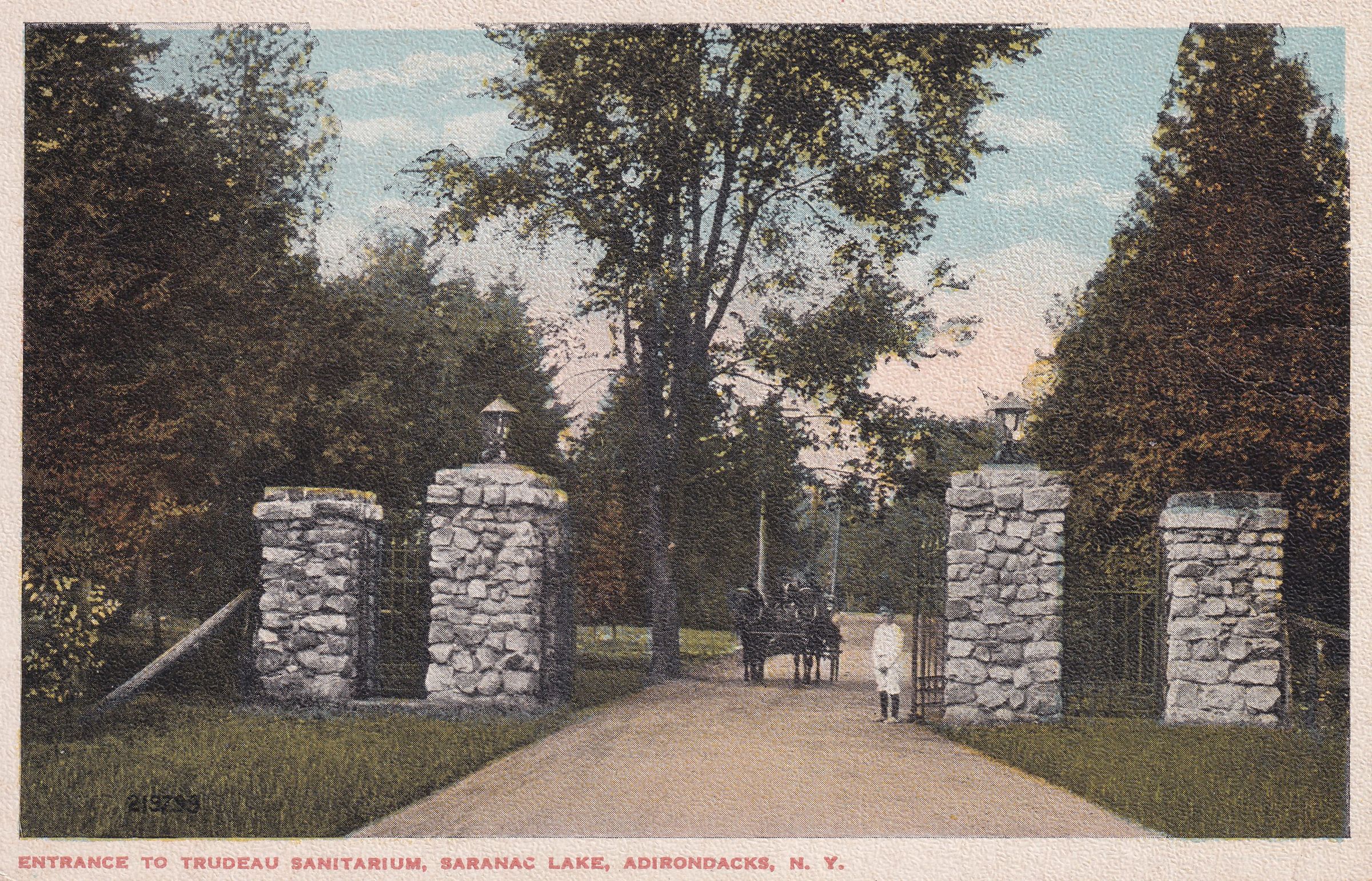 Color postcard showing the stone and iron gate at the south entrance to Trudeau Sanatorium. A small boy stands next to the gates, and a horse-drawn carriage is making its way down the road. Printed caption on front reads, "Entrance to Trudeau Sanitarium, Saranac Lake, Adirondacks, N.Y." No printers' mark. Unused, divided back, white border.Subject Place