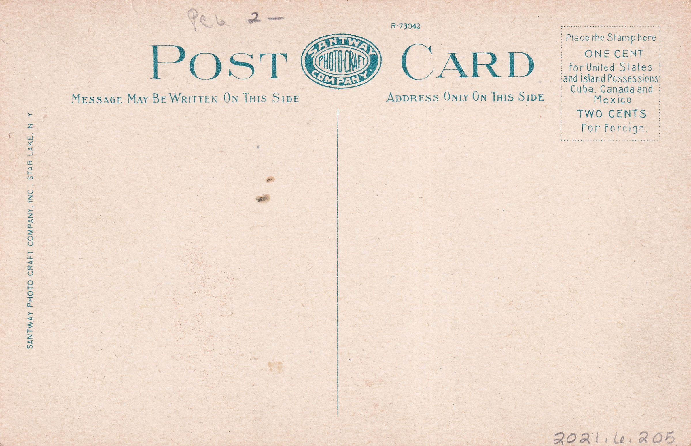 Color postcard showing the campus of the Adirondack Cottage Sanitarium (later renamed Trudeau Sanatorium), looking west. There is a person walking up the path up the hill, and many of the Sanatorium buildings can be seen, including the Administration Building. Printed caption on front reads, "Cottage Sanitarium, Trudeau, N.Y., Near Saranac Lake." Printed by the Santway Photo-Craft Company, Inc., Star Lake, NY. Unused, divided back, white border.Lexicon