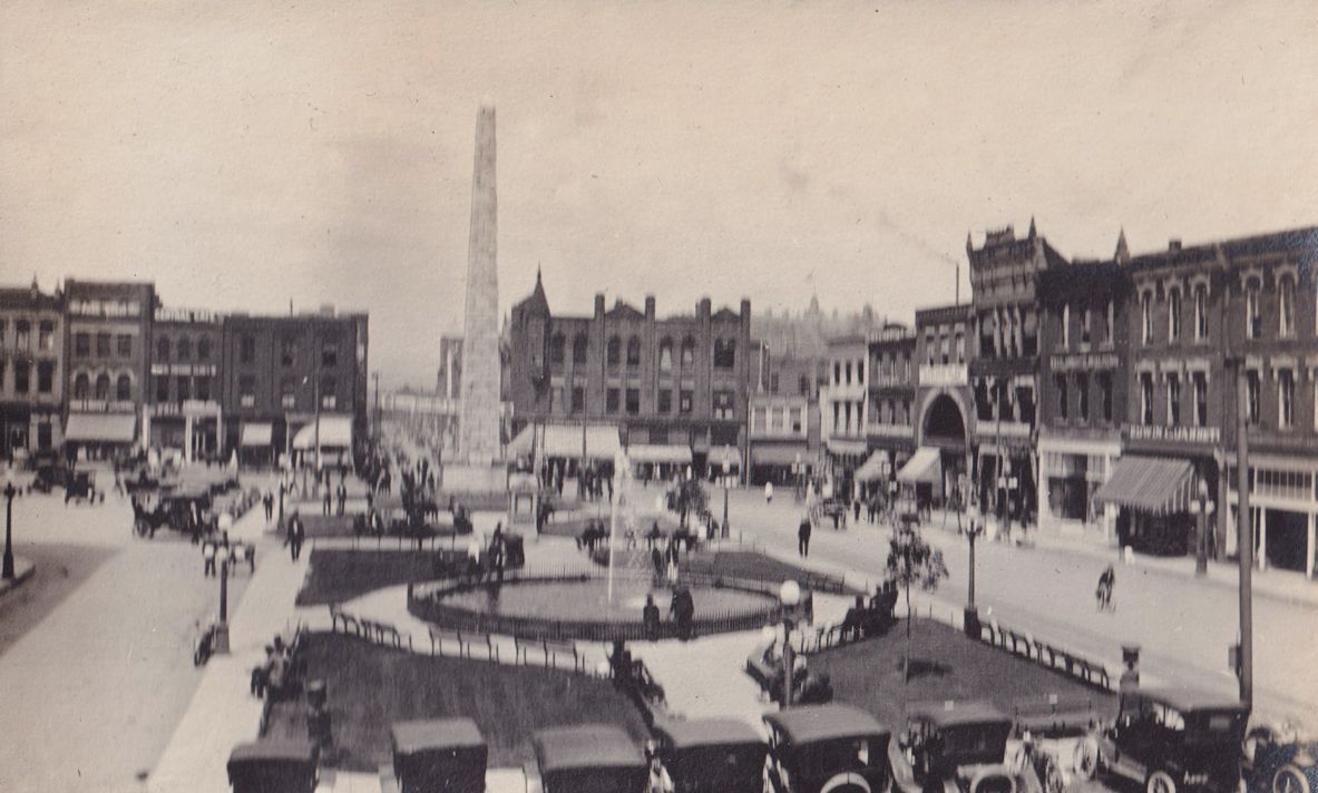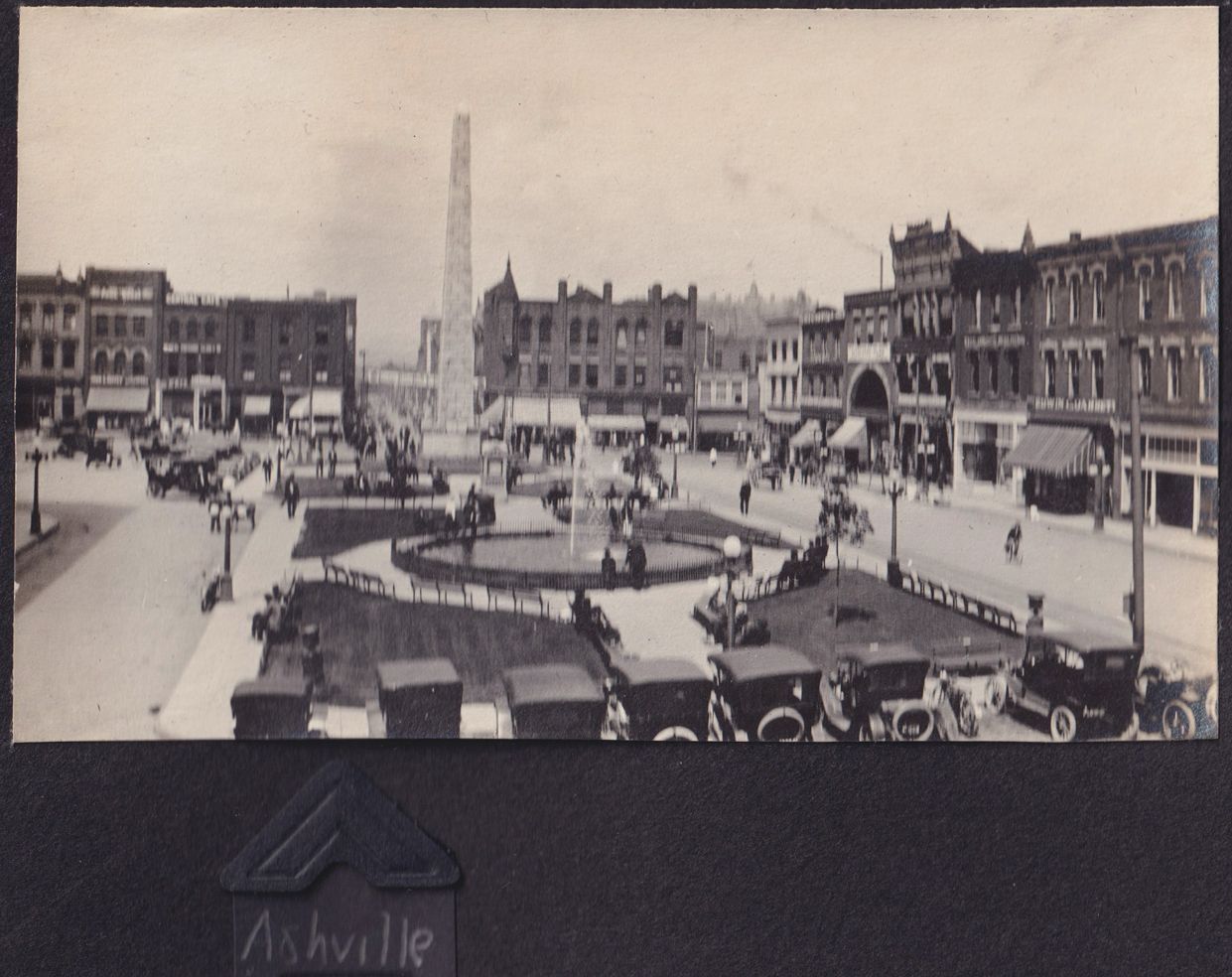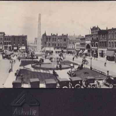 Black-and-white photograph of Pack Square in Asheville, North Carolina. There is a large fountain in the middle with an obelisk near it. "Ashville" is written in white ink beneath the photograph.