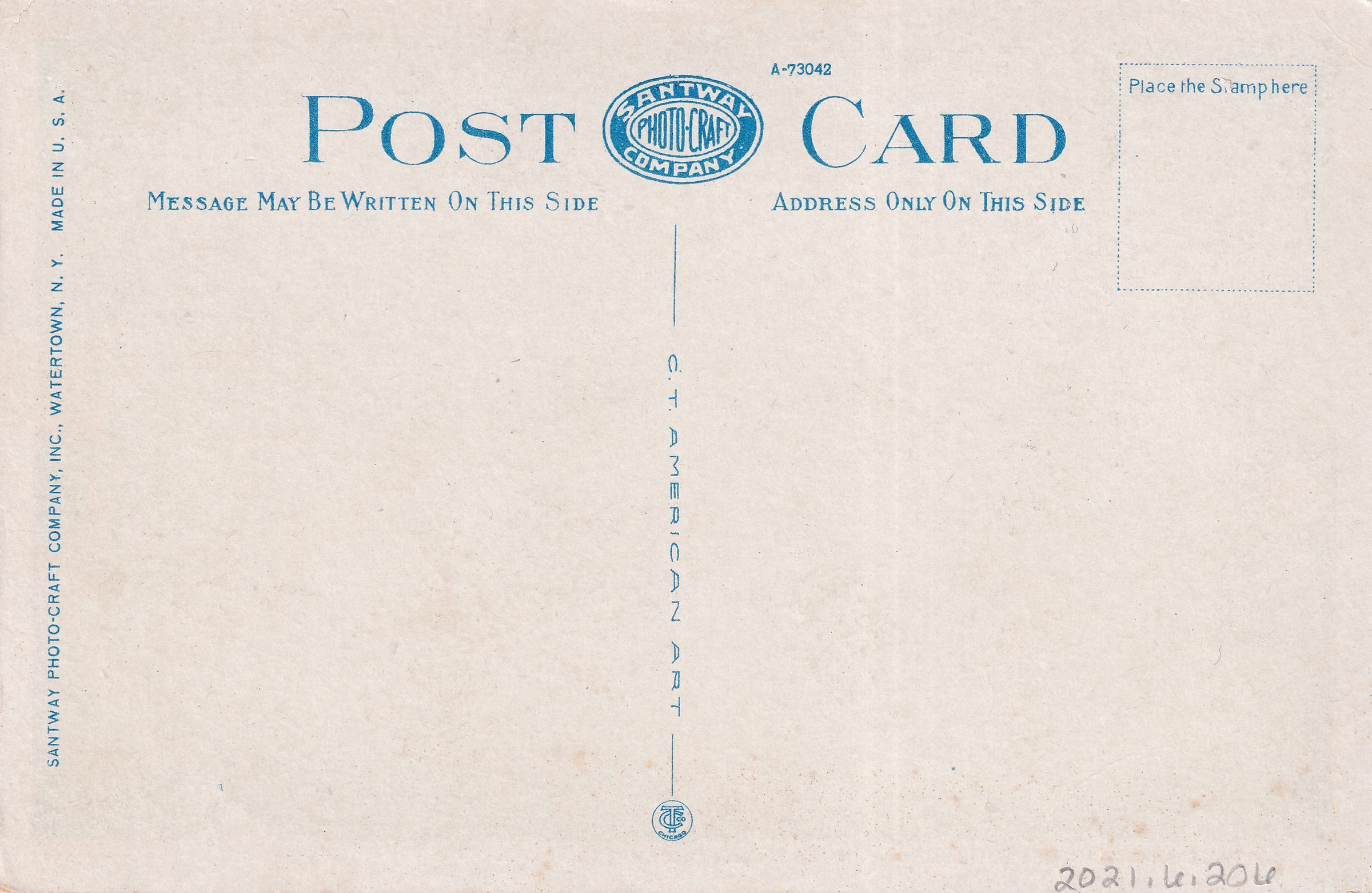 Color postcard showing the campus of the Adirondack Cottage Sanitarium (later renamed Trudeau Sanatorium), looking west. There is a person walking up the path up the hill, and many of the Sanatorium buildings can be seen, including the Administration Building. Printed caption on front reads, "Cottage Sanitarium, Trudeau, N.Y., Near Saranac Lake." Printed by the Santway Photo-Craft Company, Inc., Watertown, NY. Unused, divided back, white border.Lexicon