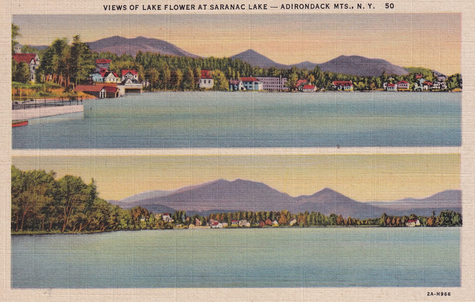 Color postcard showing two views of Lake Flower, showing homes and buildings along the shores. Printed caption on front reads, "View of Lake Flower at Saranac Lake--Adirondack Mts., N. Y." Printed by C. W. Hughes & Co., Inc., Mechanicville, NY. Unused, divided back, white border.Subject Place