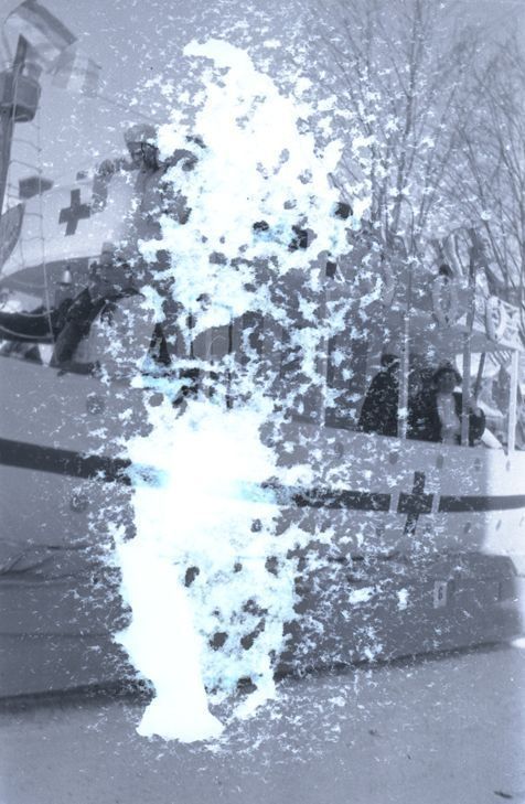 Negative of a Winter Carnival float shaped like a boat. The float holds nurses who work for the Red Cross. There are bits of paper stuck to the surface of the negative, obscuring parts of the image. Most likely taken by Mary Ives Baldwin. This item is not fully cataloged but has been uploaded so the image is publicly available; if you would like us to prioritize cataloging this item, please contact the HSL Collections team.