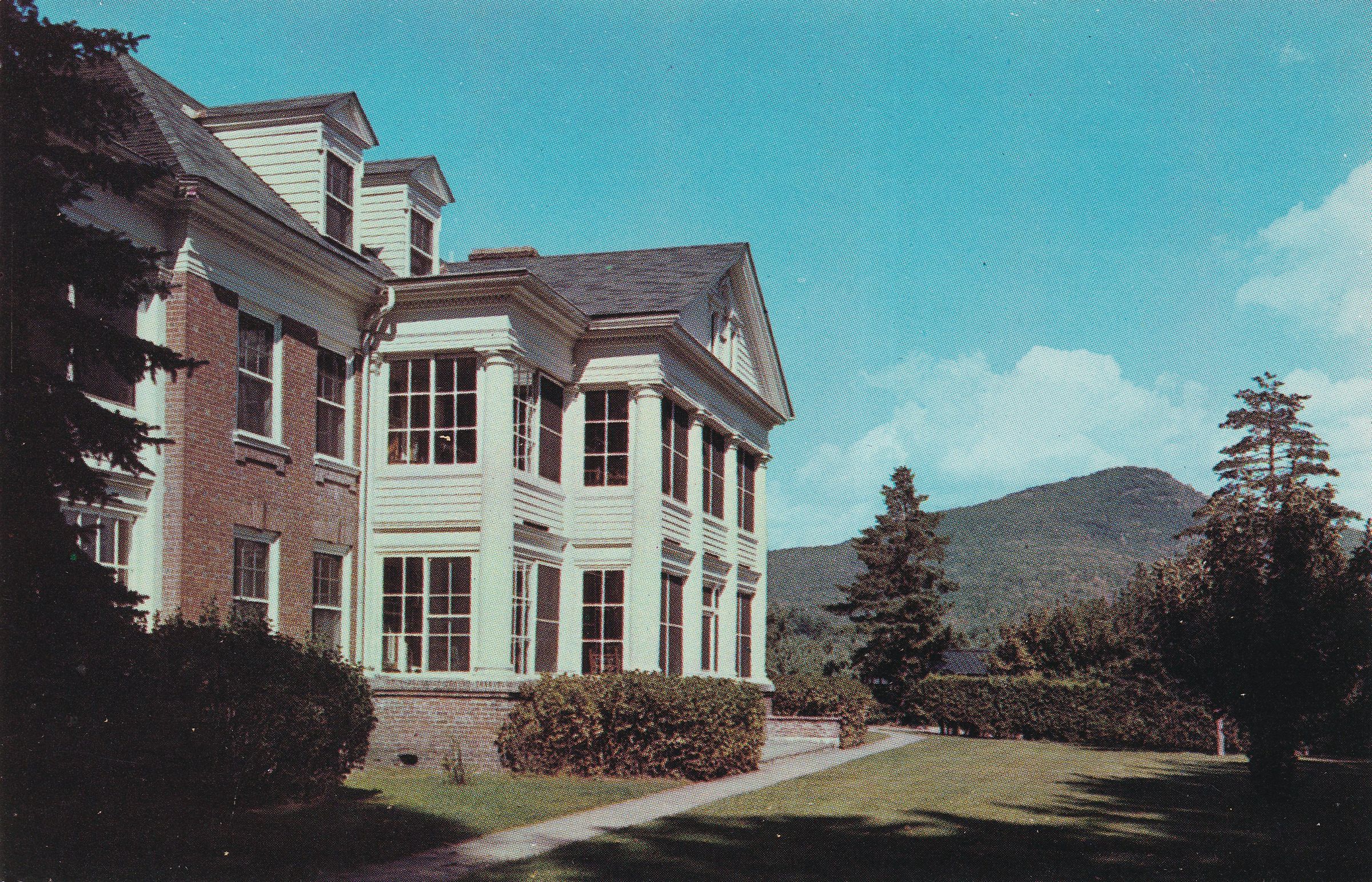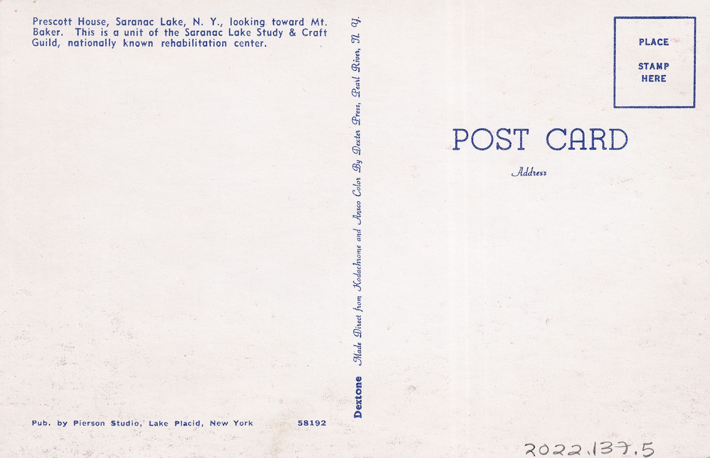 Color postcard showing the south face of Reception Hospital, AKA Prescott House. Mt. Baker is visible in the background. Printed caption on back reads, "Prescott House, Saranac Lake, N. Y., looking toward Mt. Baker. This is a unit of the Saranac Lake Study & Craft Guild, nationally known rehabilitation center." Printed by Pierson Studio, Lake Placid, NY. Unused, divided back.Subject Place