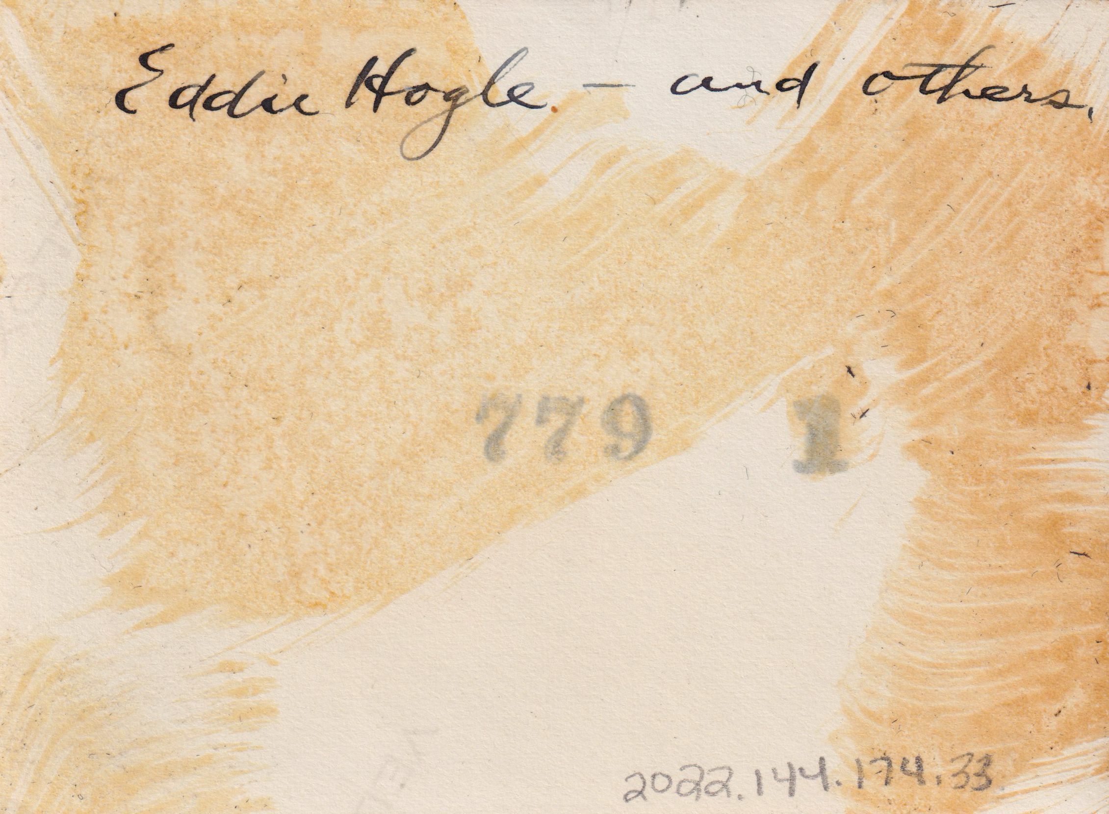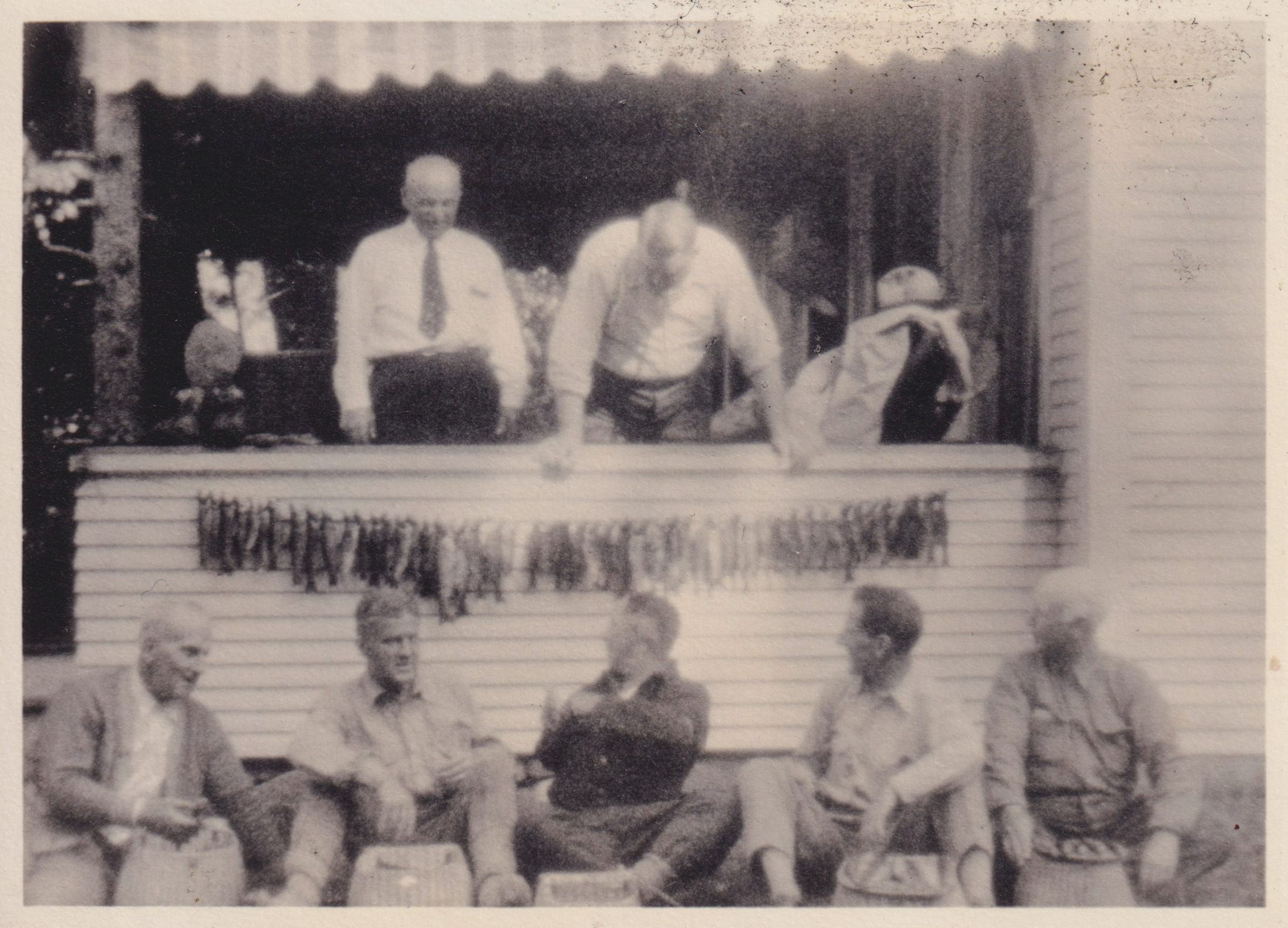 Black-and-White photograph of a group of men seated in front of a house, with two men on the porch behind them. There is a large line strung with fish across the front of the porch. Handwritten caption on back reads, "Eddie Hogle.--and others."