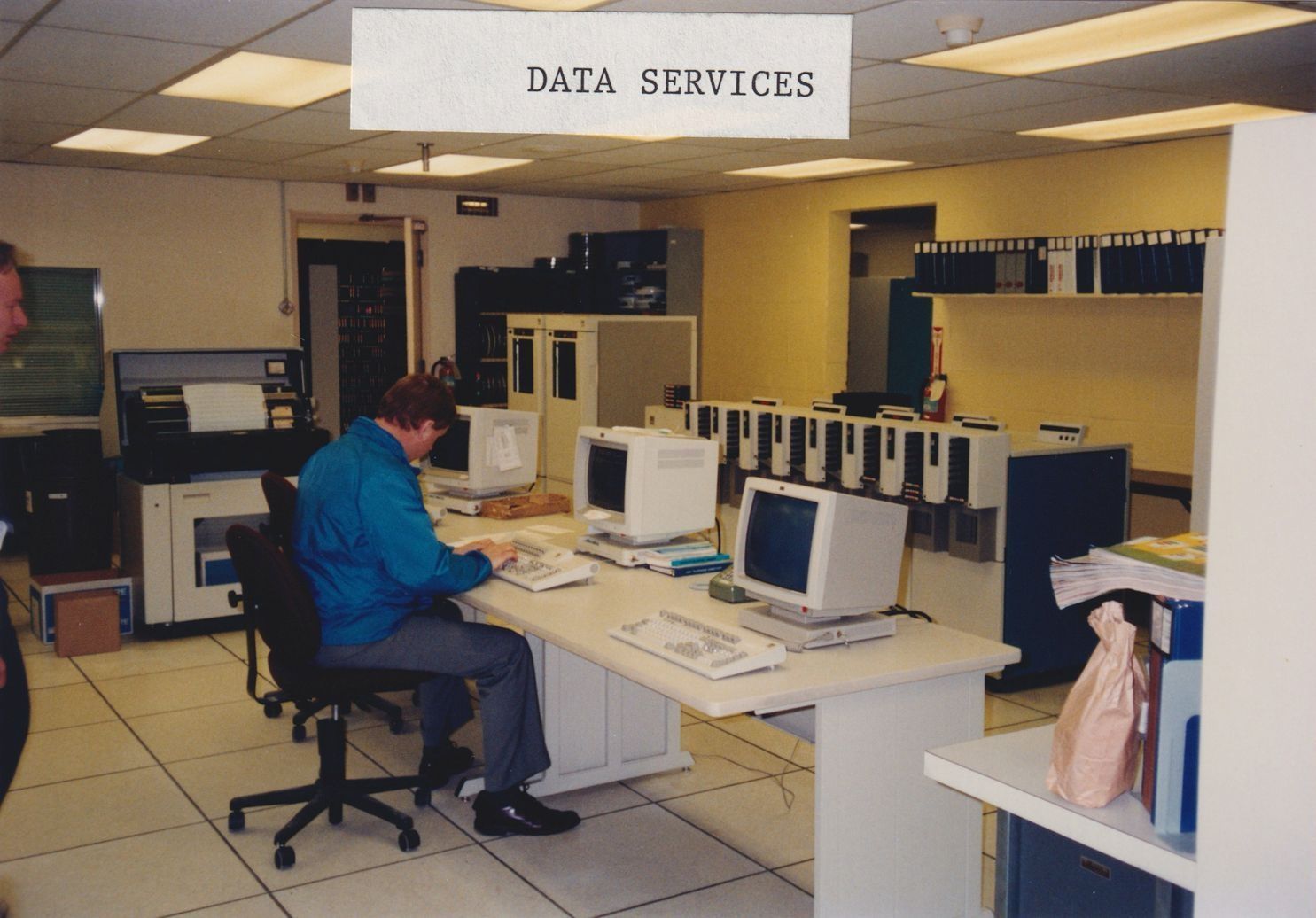 Color photograph of a man sitting at a desk with three computers on it. There are other machines in the room as well. There is a label affixed to the front of the photograph that has "Data Services" typewritten on it. This photograph is from an album of photographs taken at the American Management Association.