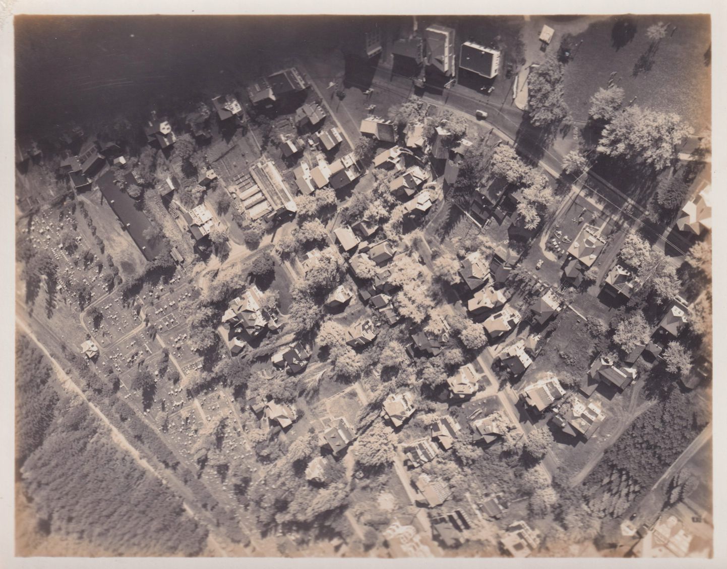Black-and-White aerial photograph of the south end of Helen Hill, including buildings on Church Street, Shepard Avenue, and Franklin Avenue. Pine Ridge Cemetery is visible at the top of the photograph. Many cure cottages can be seen in the neighborhood. Photograph may have been taken by William Kollecker, or for Kollecker's studio.Photograph Details