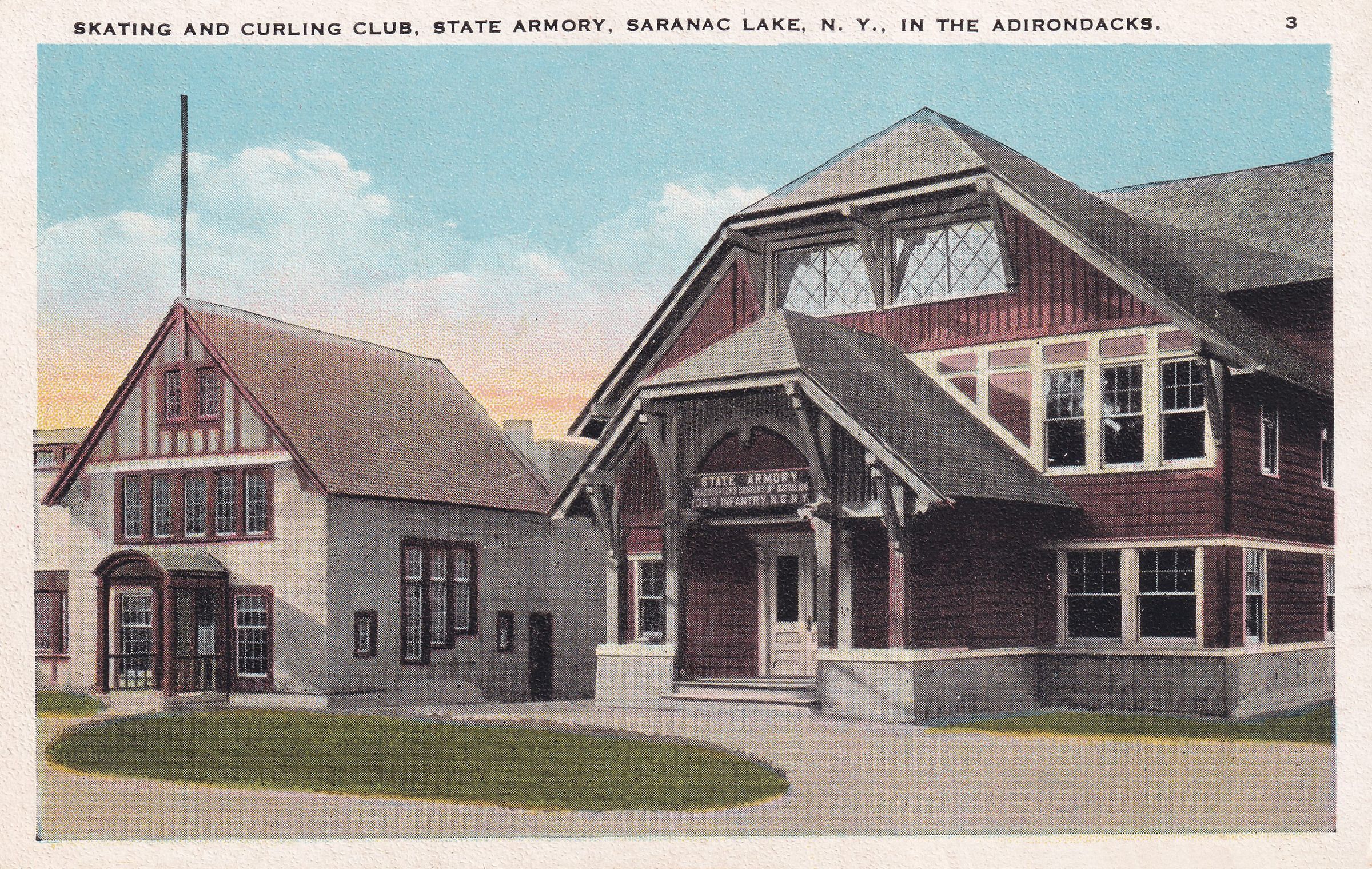 Color postcard showing the Skating and Curling Club and State Armory buildings near Pontiac Bay. Printed caption on front reads, "Skating and Curling Club, State Armory, Saranac Lake, N. Y. in the Adirondacks." Printed by Tichnor Quality Views. Unused, divided back, white border.Subject Place