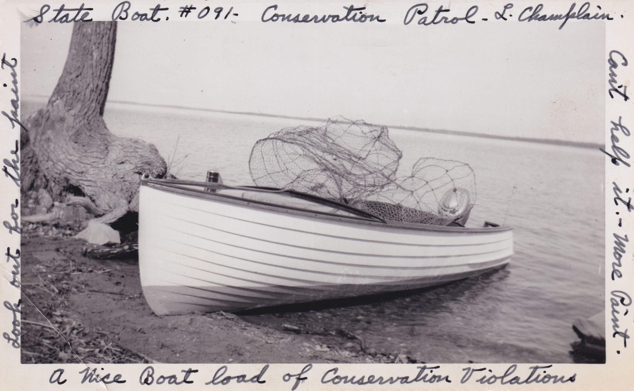 Black-and-White photograph of a boat on the shore of Lake Champlain. There are several fish traps in the boat. Handwritten caption on front reads, "A nice boat load of conservation violations. Look out for the paint. Can't help it. - More paint. State Boat. #091 - Conservation patrol. L. Champlain." Print has decorative scalloped edges.