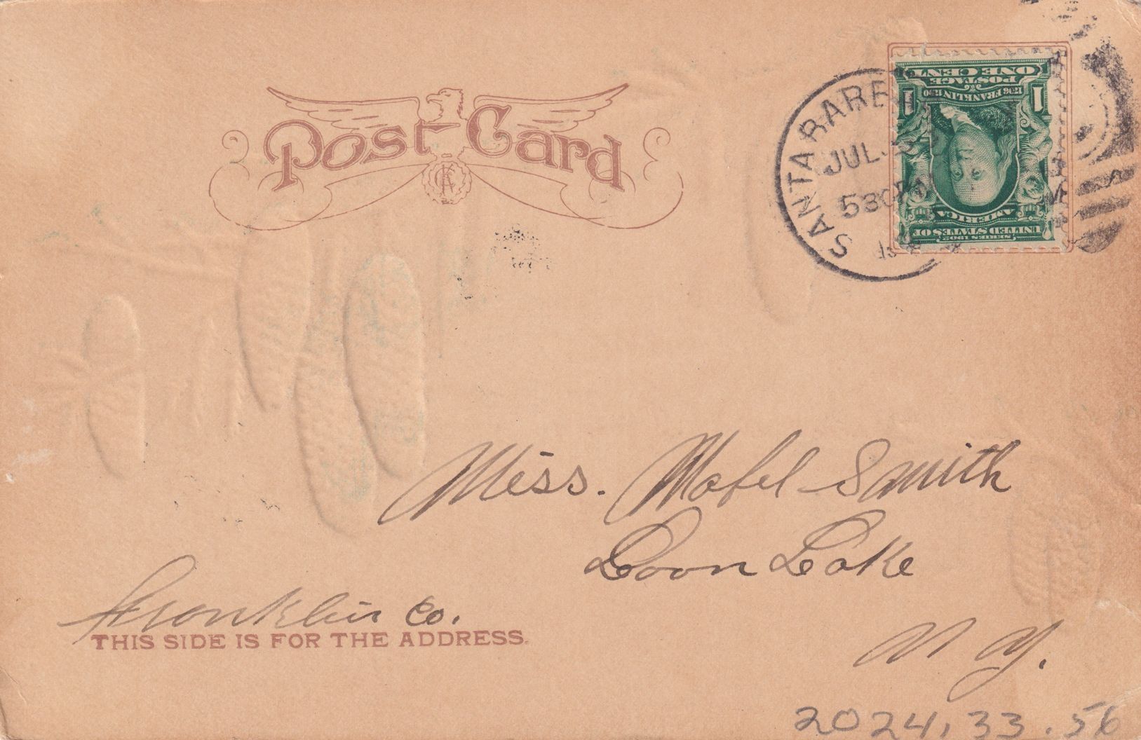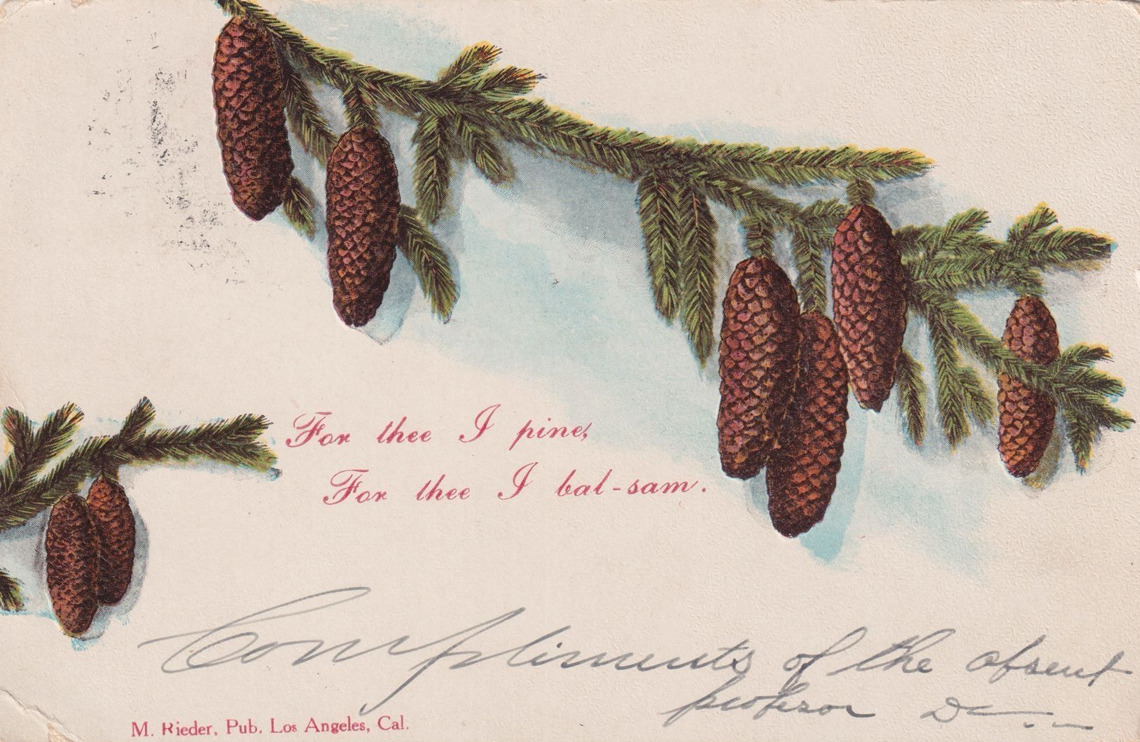 Color postcard with an illustration of pine cones on a white background. The postcard is addressed to Miss Mabel Smith of Loon Lake.