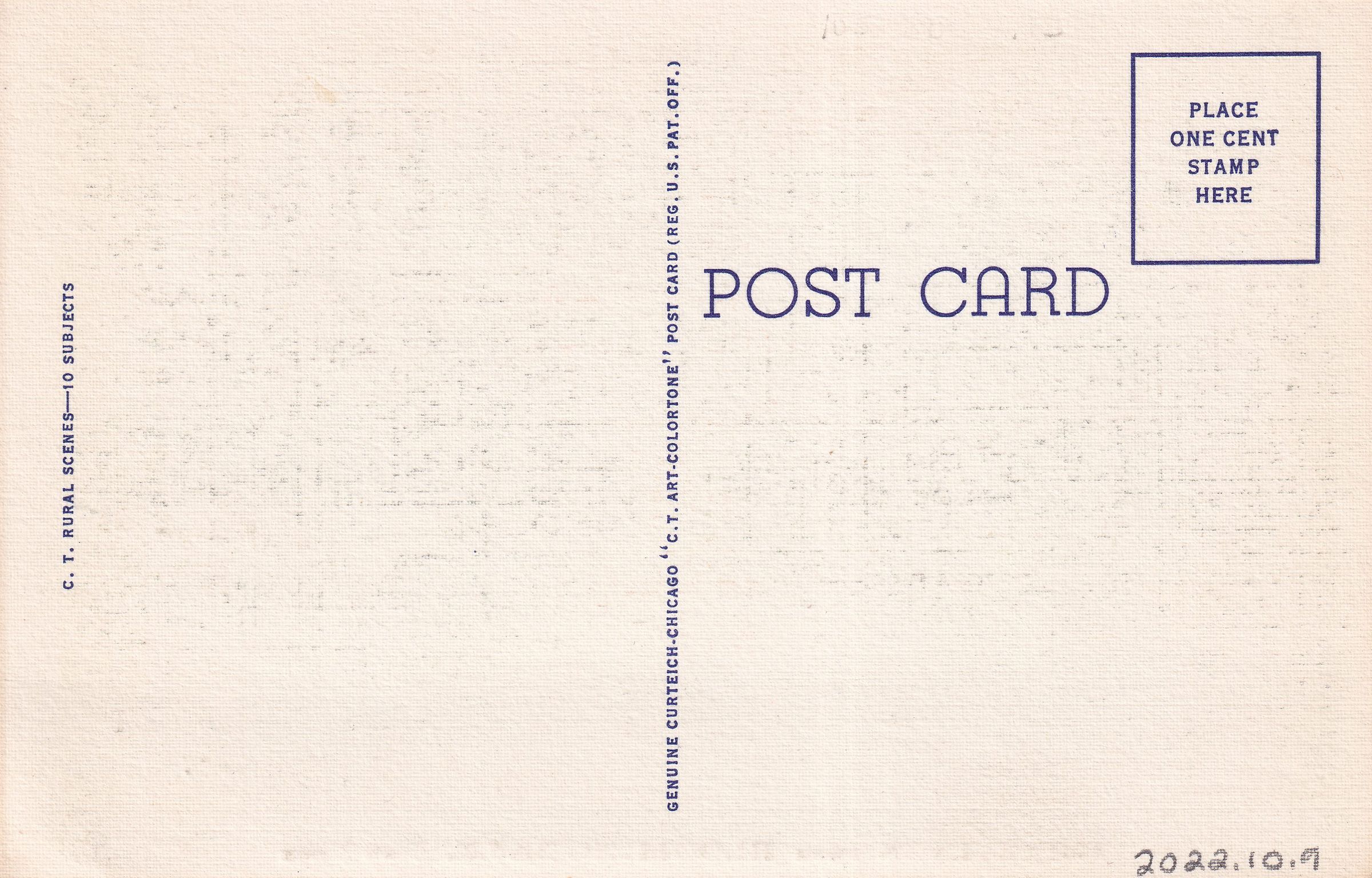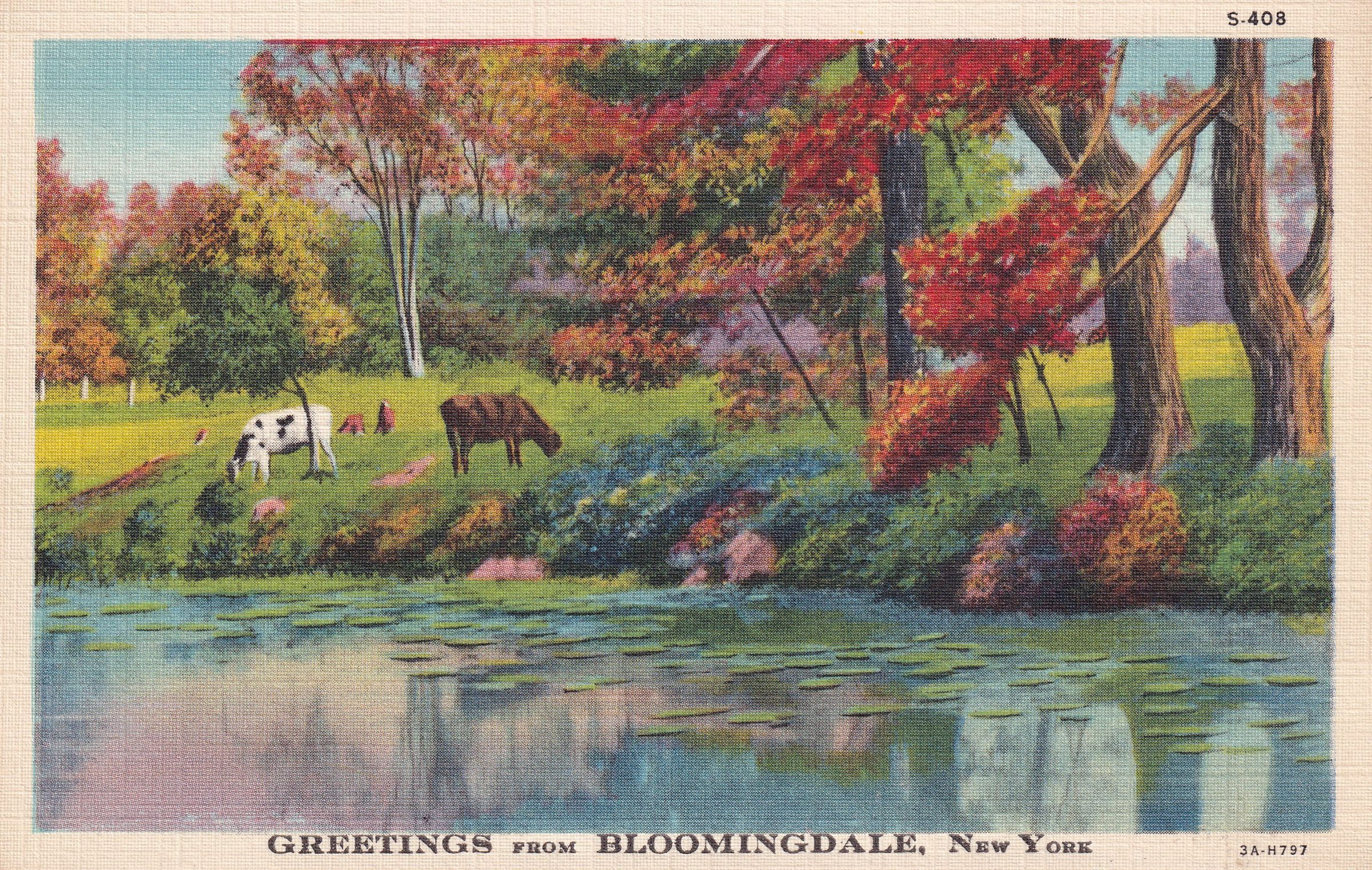 Color postcard showing cows grazing along a river bank. Printed caption on front reads, "Greetings from Bloomingdale, New York." Printed by Curteich Chicago, "C.T. Art-Colortone." Unused, divided back, white border.Subject Place