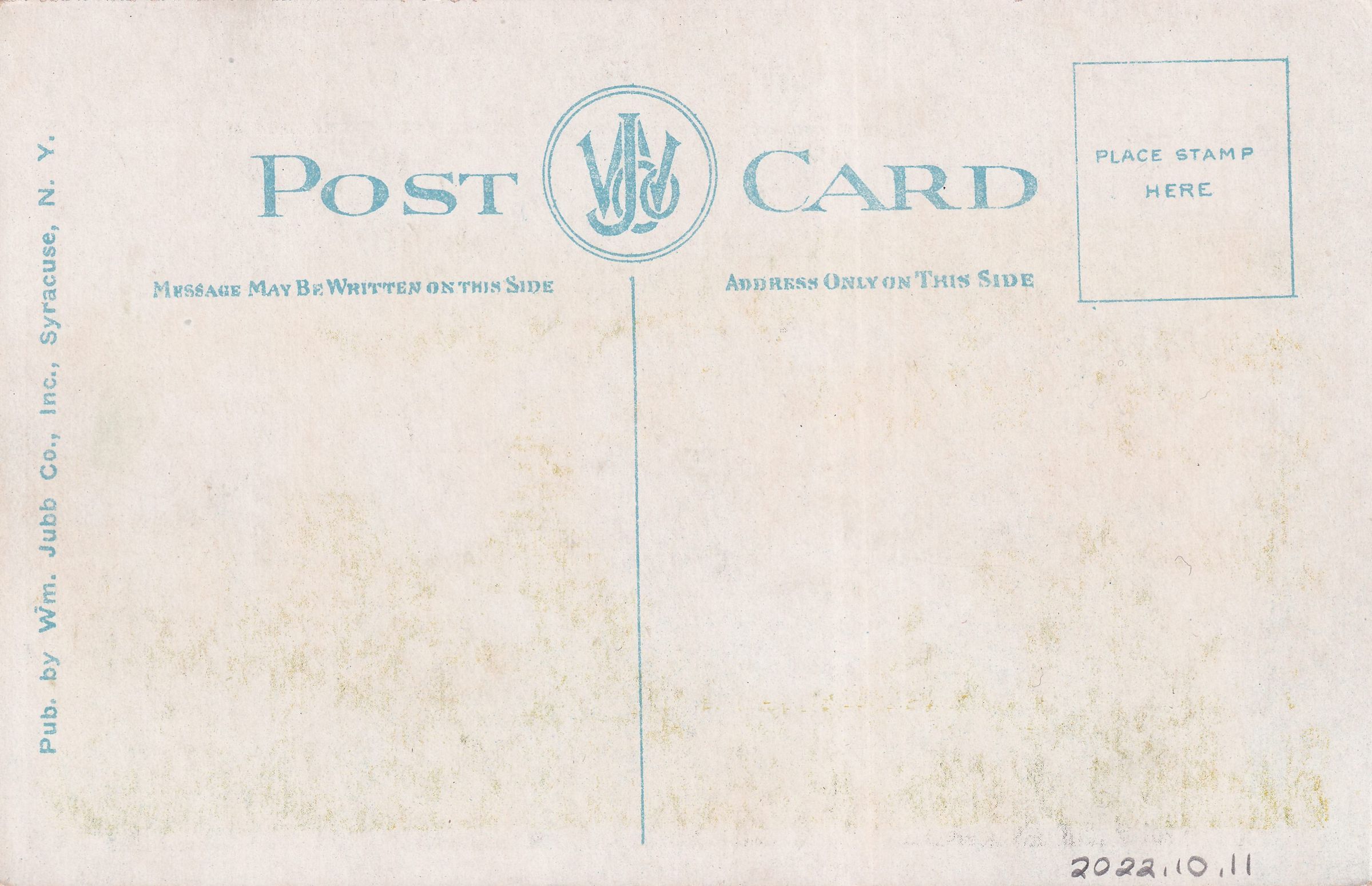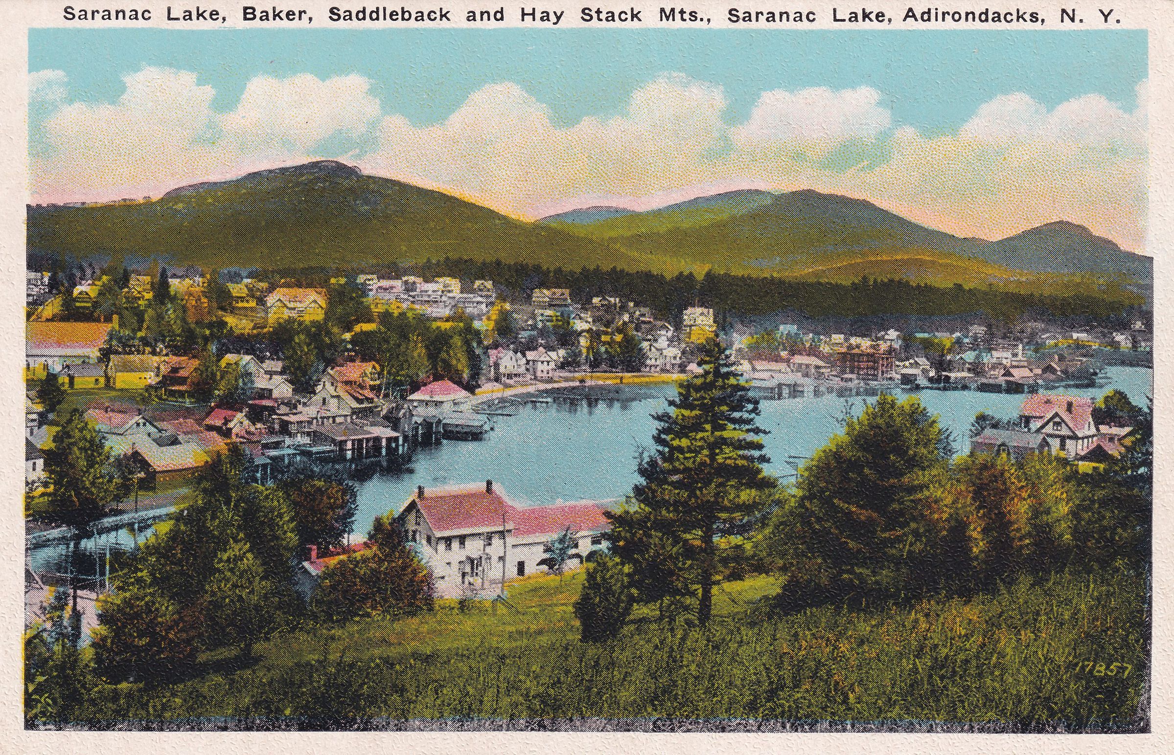 Color postcard showing a view of Lake Flower, the village of Saranac Lake, and the mountains behind, as seen from Blood Hill / Lake Street Hill. Printed caption on front reads, "Saranac Lake, Baker, Saddleback and Hay Stack Mts., Saranac Lake, Adirondacks, N.Y." Printed by Wm. Jubb Co., Inc., Syracuse, NY. Unused, divided back, white border.Subject Place