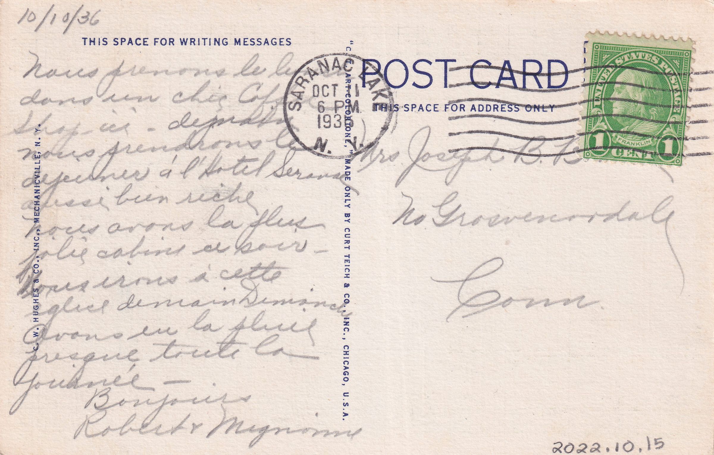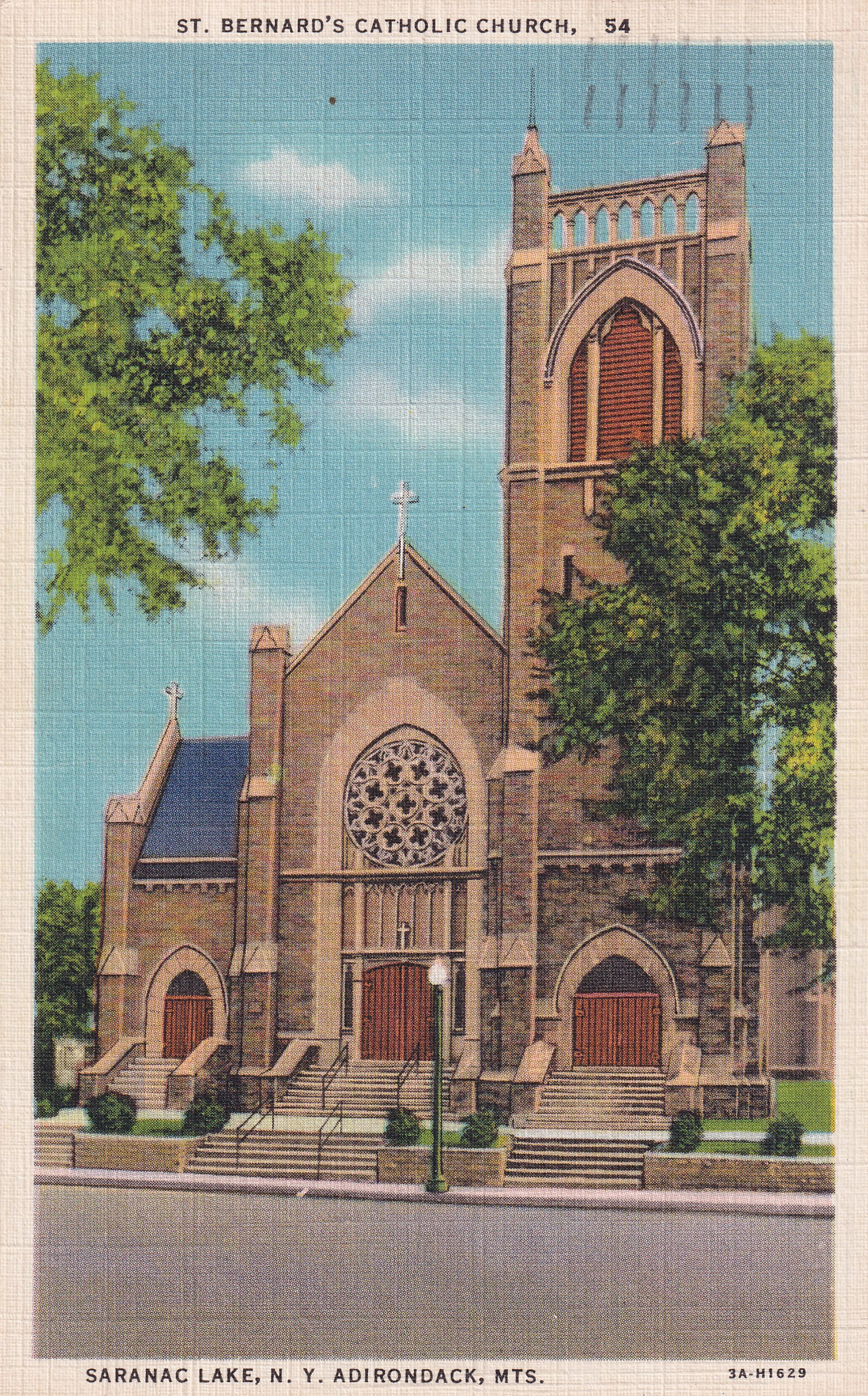 Color postcard showing the second St. Bernard's Church. Printed caption on front reads, "St. Bernard's Catholic Church, Saranac Lake, N. Y." Printed by C. W. Hughes & Co., Inc., Mechanicville, NY. Used, divided back, white border, postmarked Saranac Lake, October 1, 1936. Handwritten message on back begins, "10/10/36." The rest of the message is in French. Mailed to Mrs. Joseph B. B[obscured by stamp], No. Grosvenordale, CT.Subject Place