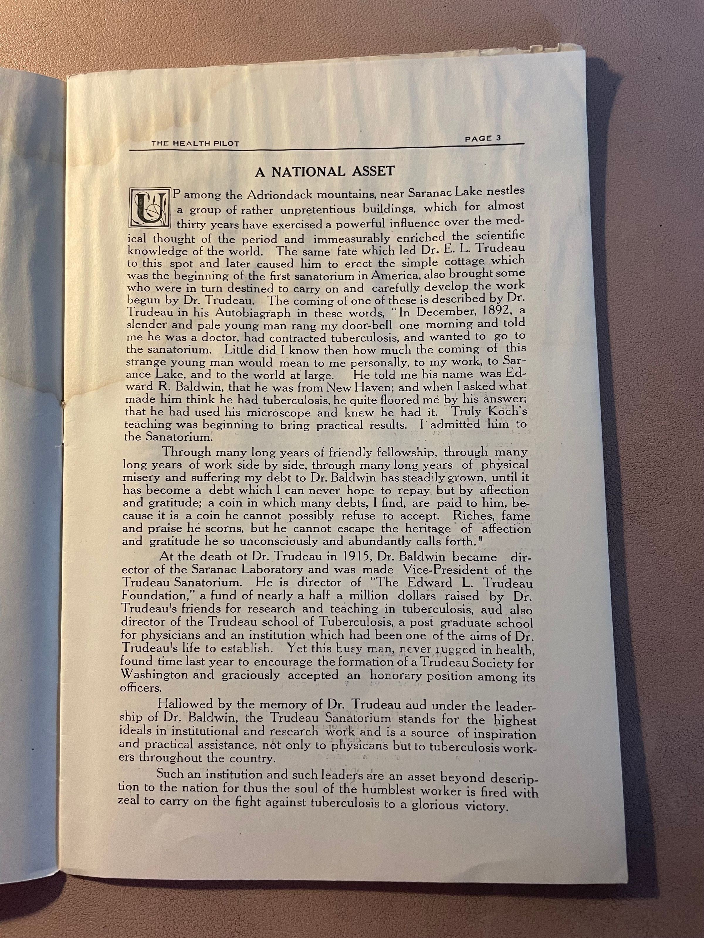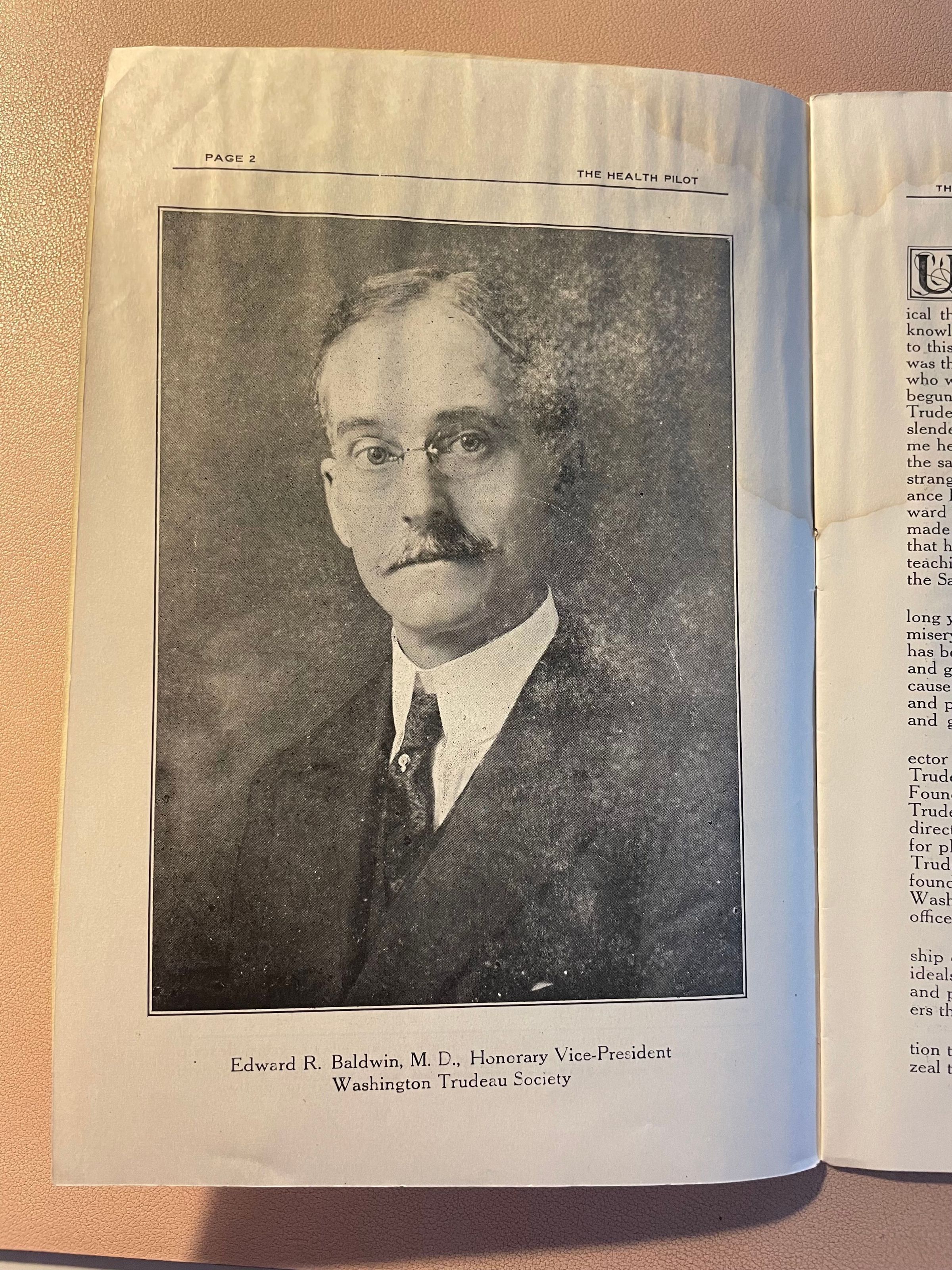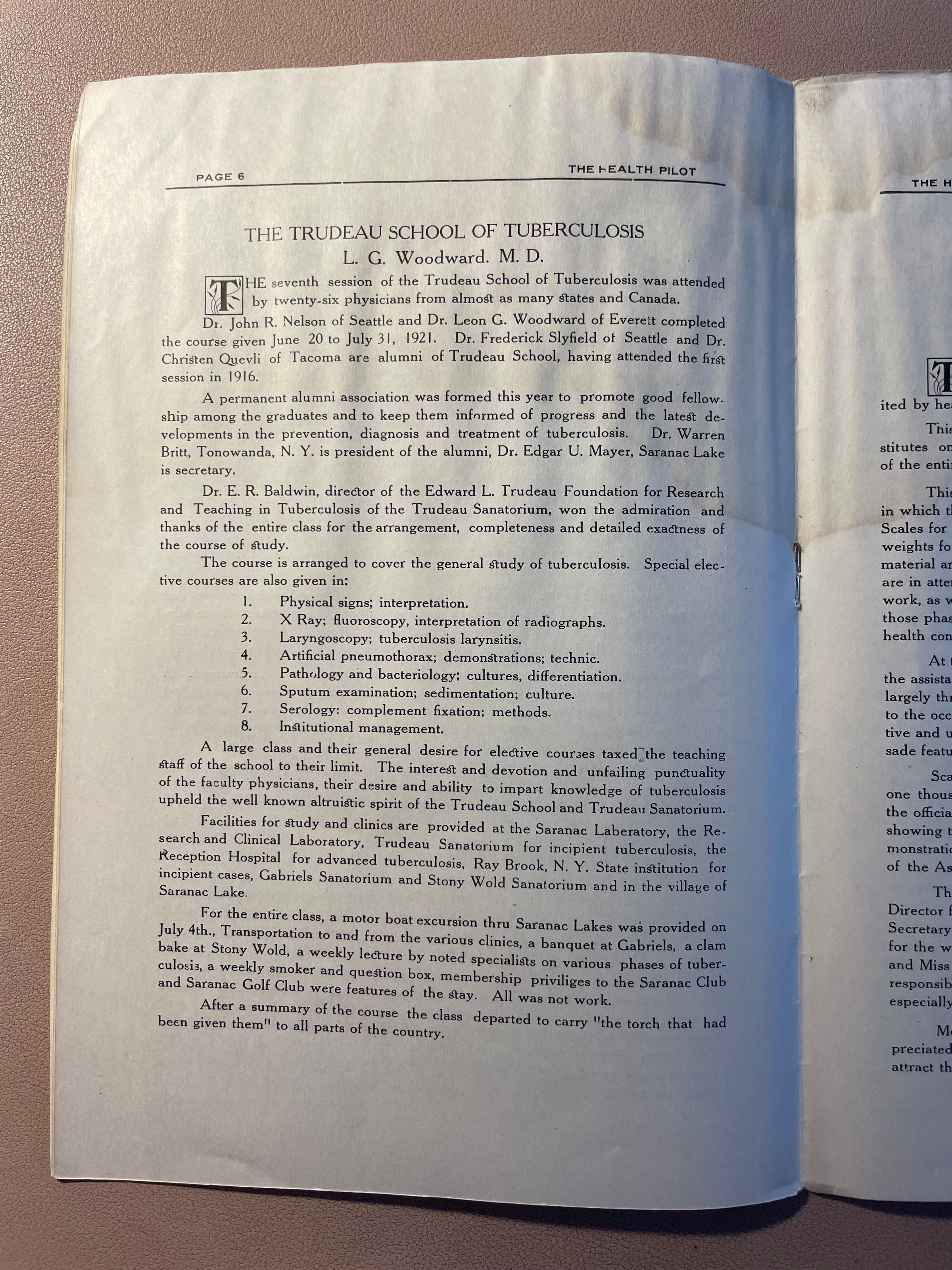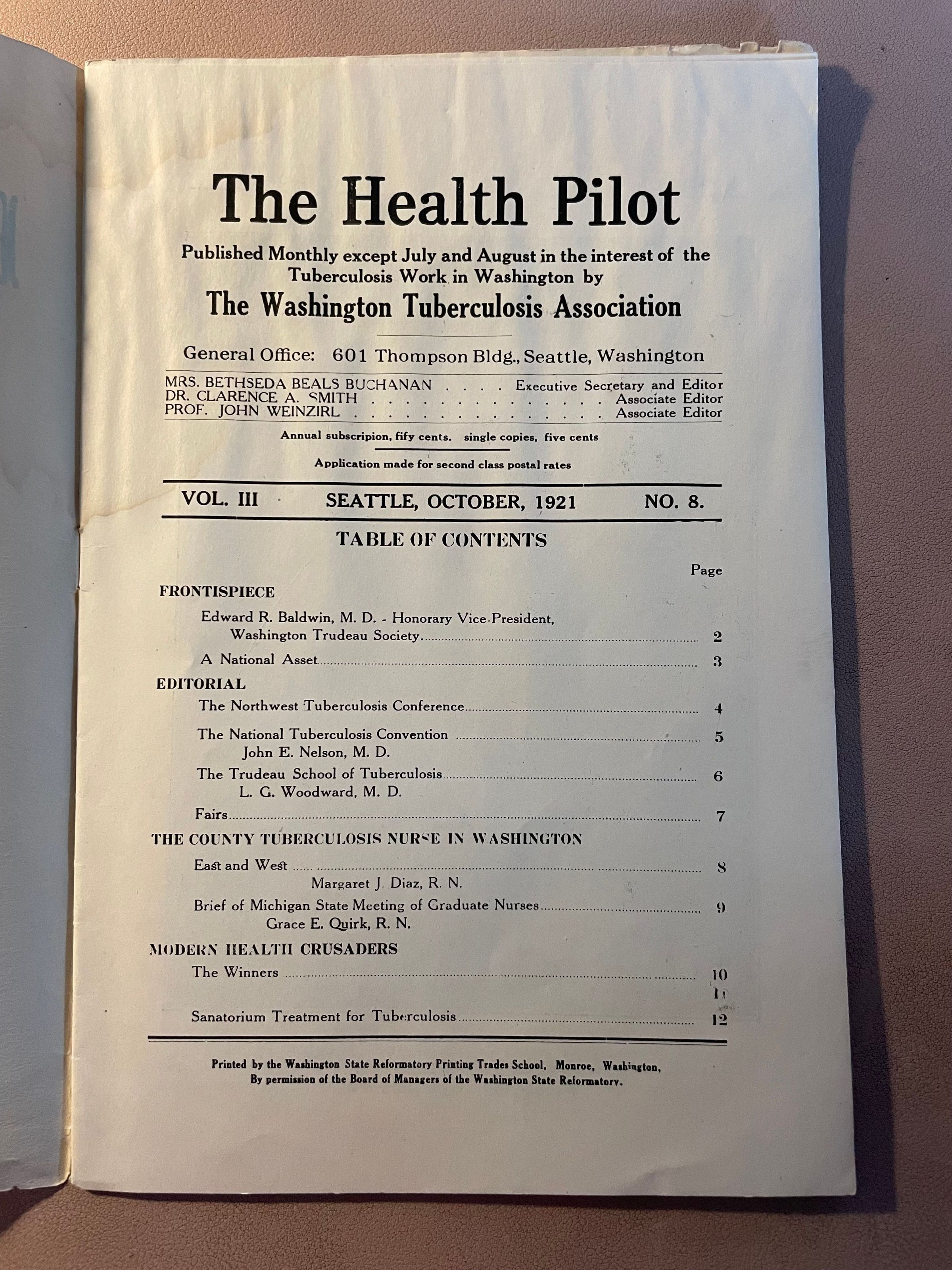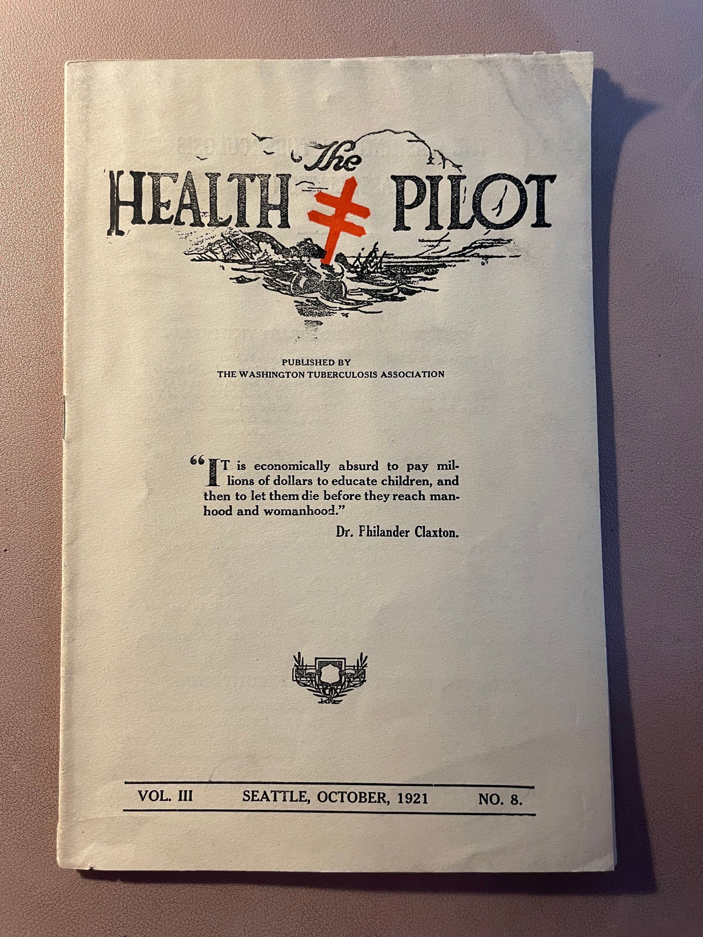 The Health Pilot, Vol. II, No. 8, October 1921. A publication of the Washington Tuberculosis Association, Seattle, WA. Includes an article about Dr. Edward R. Baldwin, who served as honorary Vice President of the Washington Trudeau Society, and articles about the National Tuberculosis Convention and the Trudeau School of Tuberculosis. Softcover, 12p.Lexicon