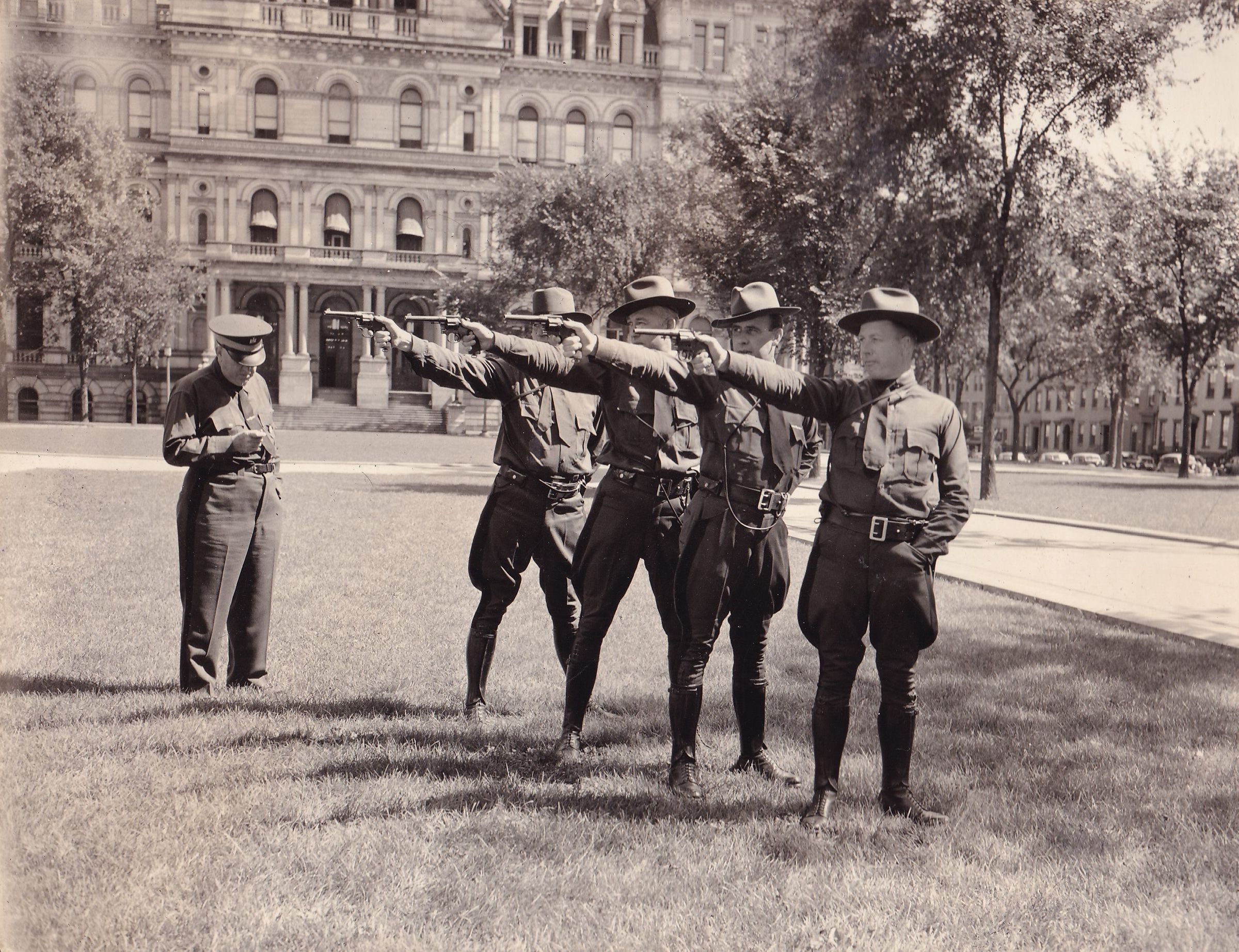 Black-and-White photograph of a line of men in game warden uniforms holding raised pistols out in front of them. The west face of the Albany State Capitol Building is visible behind them.
