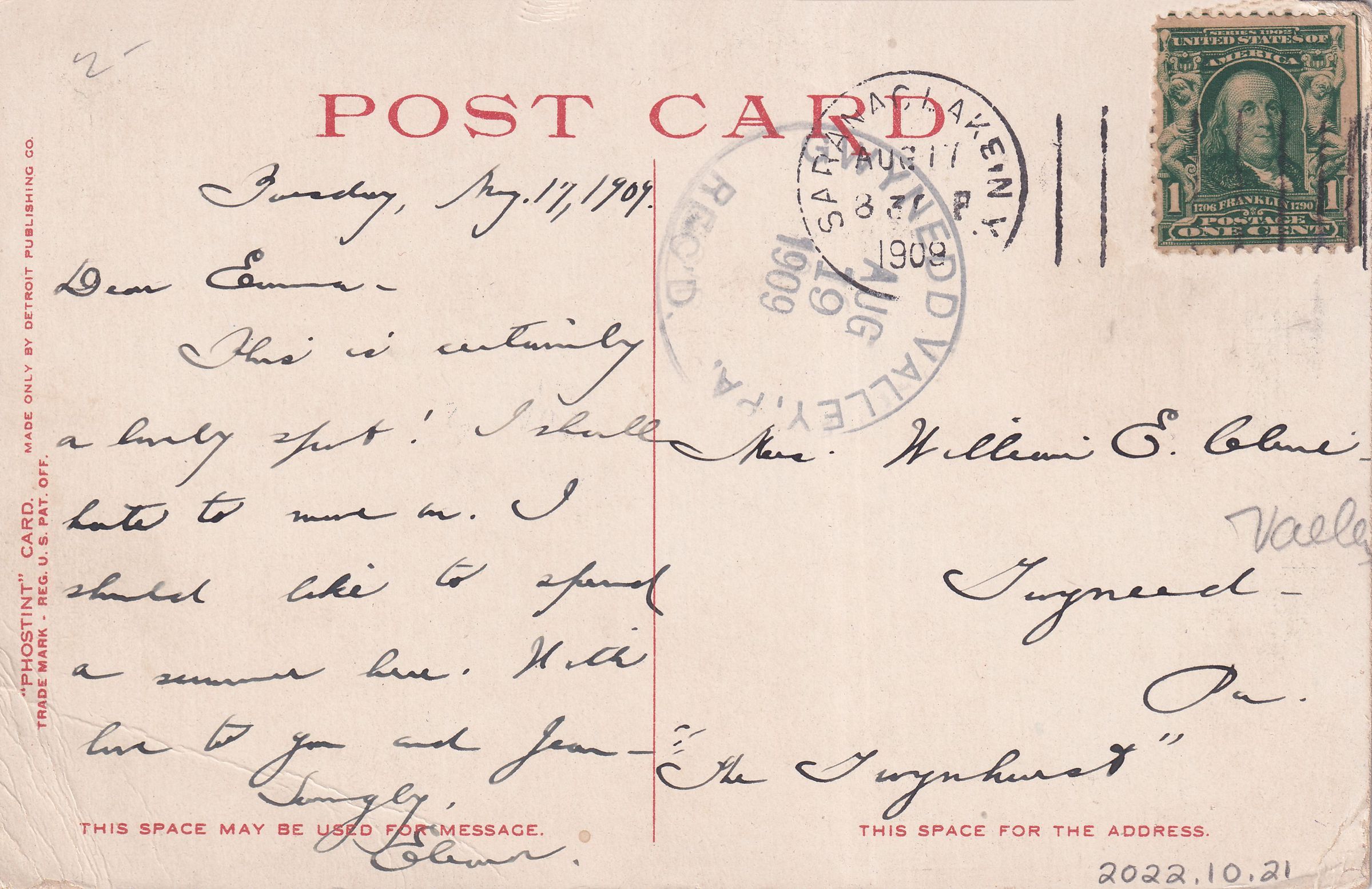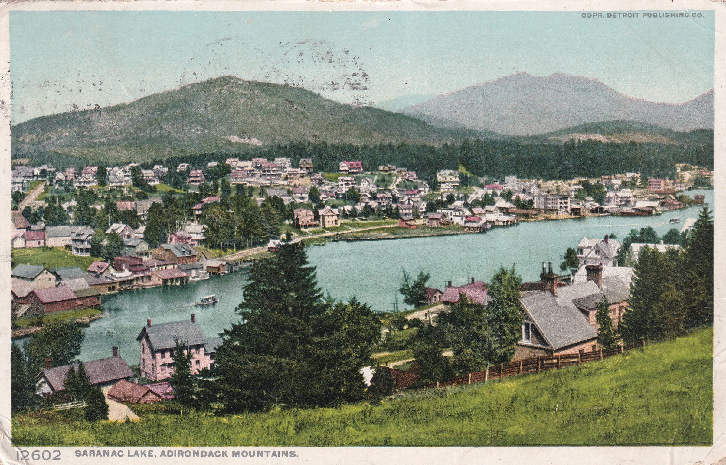 Color postcard showing a view of Saranac Lake and Lake Flower from Blood Hill / Lake Street Hill. Printed caption on front reads, "Saranac Lake, Adirondack Mountains." A "Photostint" card printed by Detroit Publishing Co. Used, divided back, white border, postmarked Saranac Lake, August 17, 1909. Handwritten caption on back reads, "Tuesday, Aug. 17, 1909. Dear Emma--This is certainly a lovely spot! I shall hate to move on. I should like to spend a summer here. With love to you and Jean. Lovingly, Eleanor." Mailed to Mrs. William E. Blume, Ganymeed, PA.Subject Place