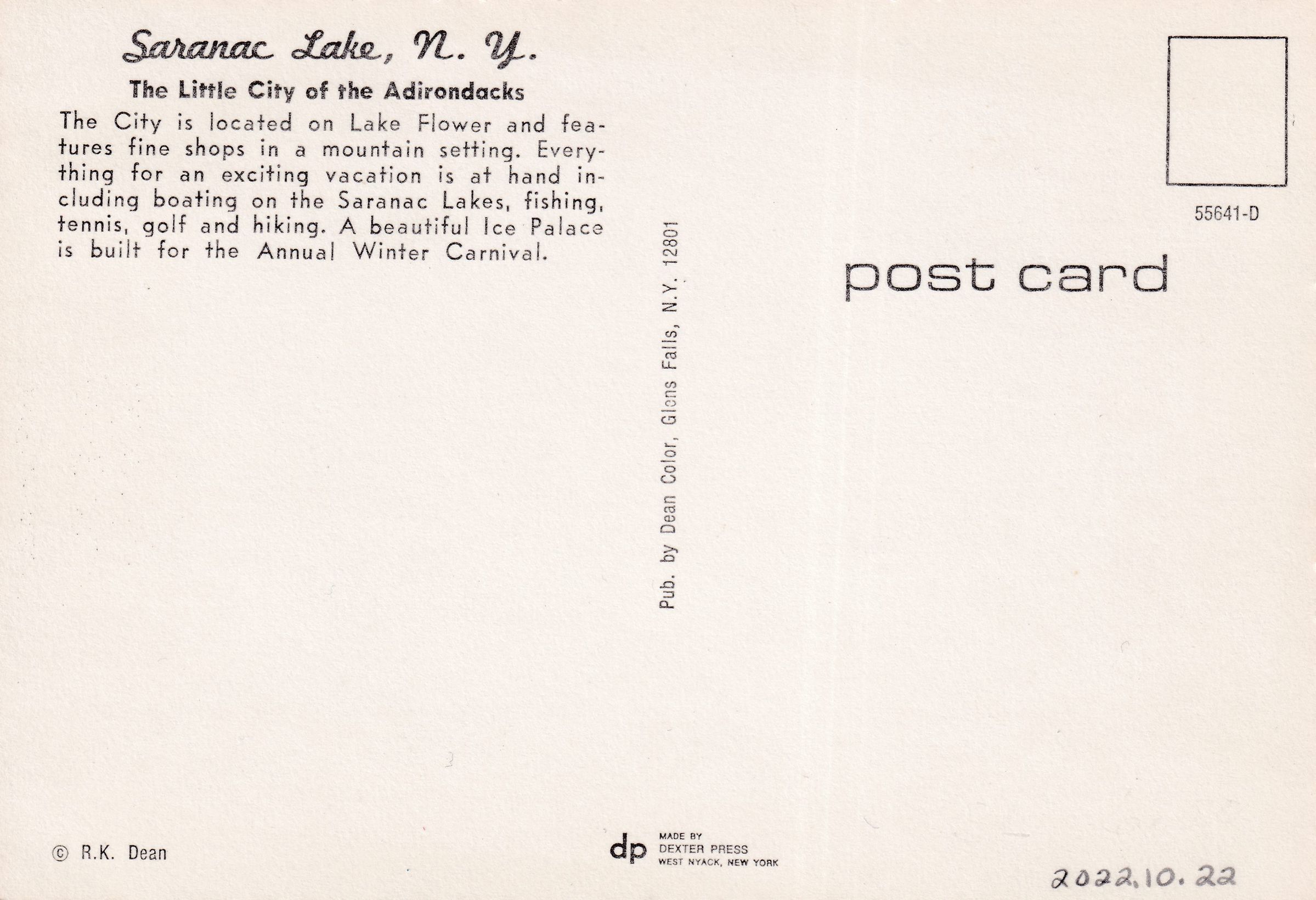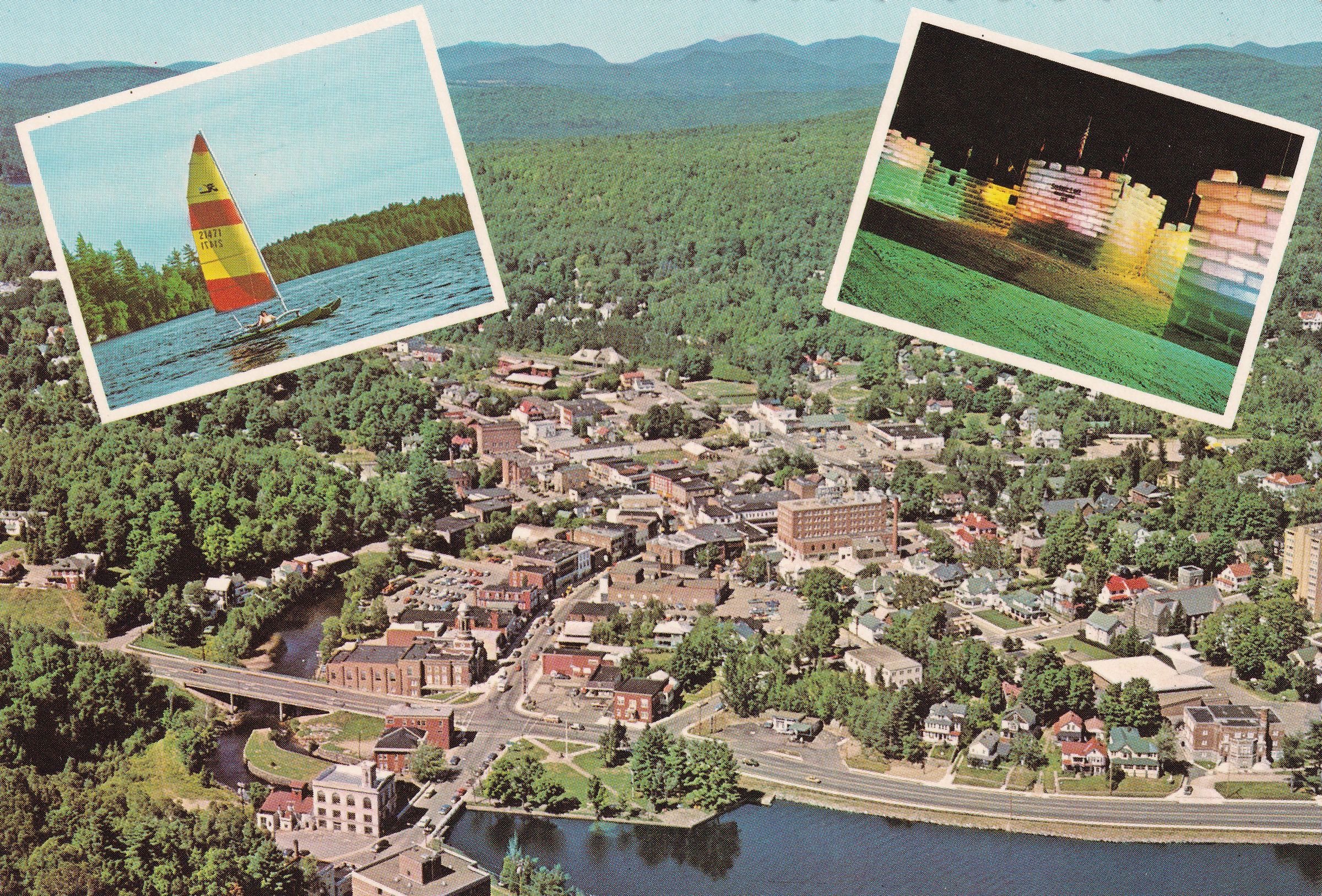 Color postcard showing an aerial view of the village of Saranac Lake looking north from Lake Flower. There are two inset images, one of a sailboat on a lake, and one of an Ice Palace lit with colored lights. Printed caption on back reads, "Saranac Lake, N. Y. The Little City in the Adirondacks. The City is located on Lake Flower and features fine shops in a mountain setting. Everything for an exciting vacation is at hand including boating on the Saranac Lakes, fishing, tennis, golf and hiking. A beautiful Ice Palace is built for the Annual Winter Carnival." Printed by Dean Color, Glens Falls, NY. Unused, divided back, scalloped edges.Subject Place