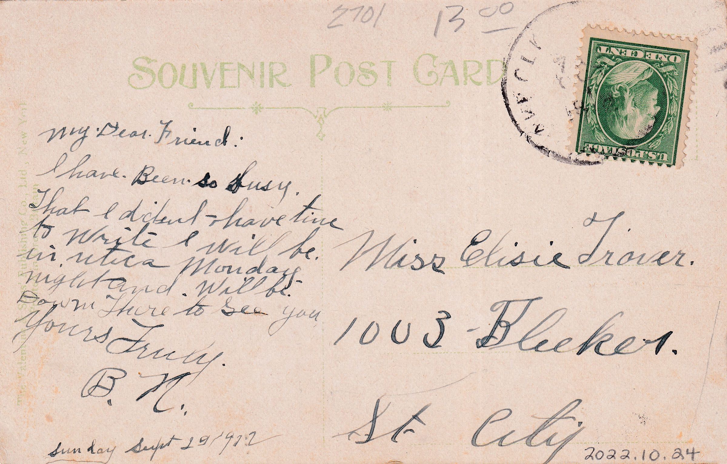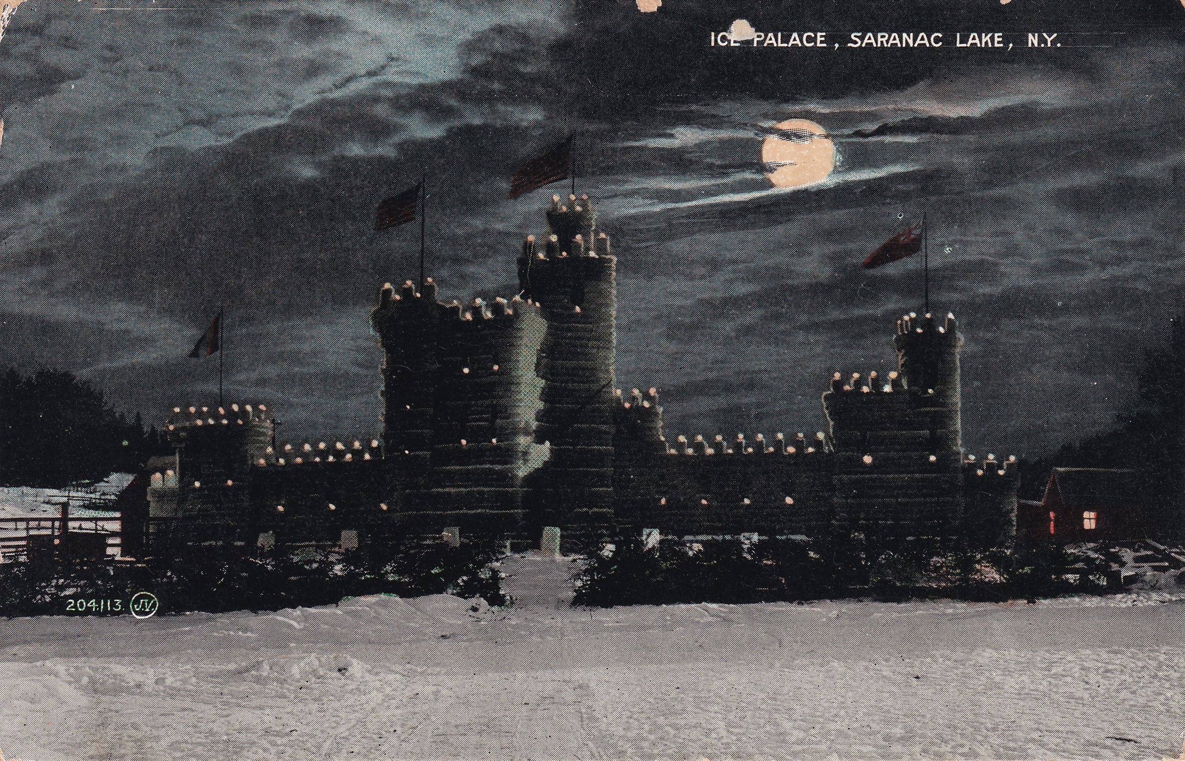 Color postcard showing a view of an Ice Palace in the moonlight, possibly for Winter Carnival 1910. Printed caption on front reads, "Ice Palace, Saranac Lake, NY." Printed by the Valentine & Sons' Publishing Co., Ltd., New York. Used, divided back, postmark illegible. Handwritten message on back reads, "My Dear Friend: I have been so busy that I didn't have time to write. I will be in Utica Monday night and will be down there to see you. Yours truly, B. N. Sunday Sept. 19, 1912." Mailed to Miss Elisie Trover, 1003 Bleeker St., City.Subject Place