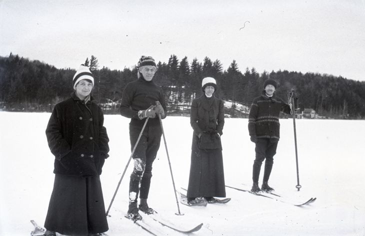 Negative of four unidentified people, two men and two women, standing on an ice-covered lake in either cross country skis or snowshoes. Most likely taken by Mary Ives Baldwin. This item is not fully cataloged but has been uploaded so the image is publicly available; if you would like us to prioritize cataloging this item, please contact the HSL Collections team.