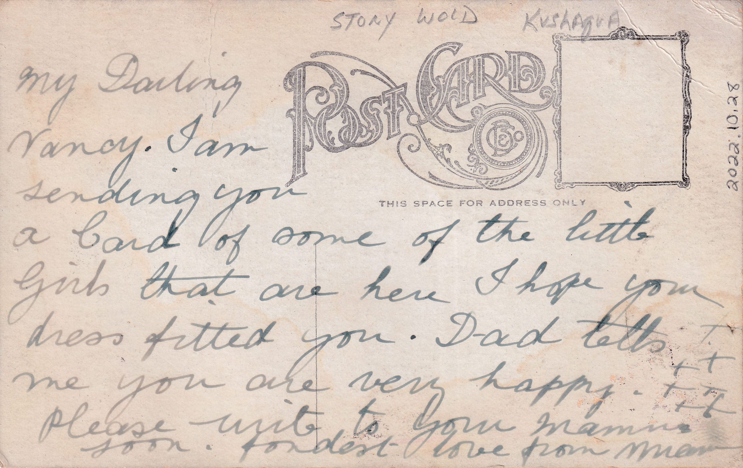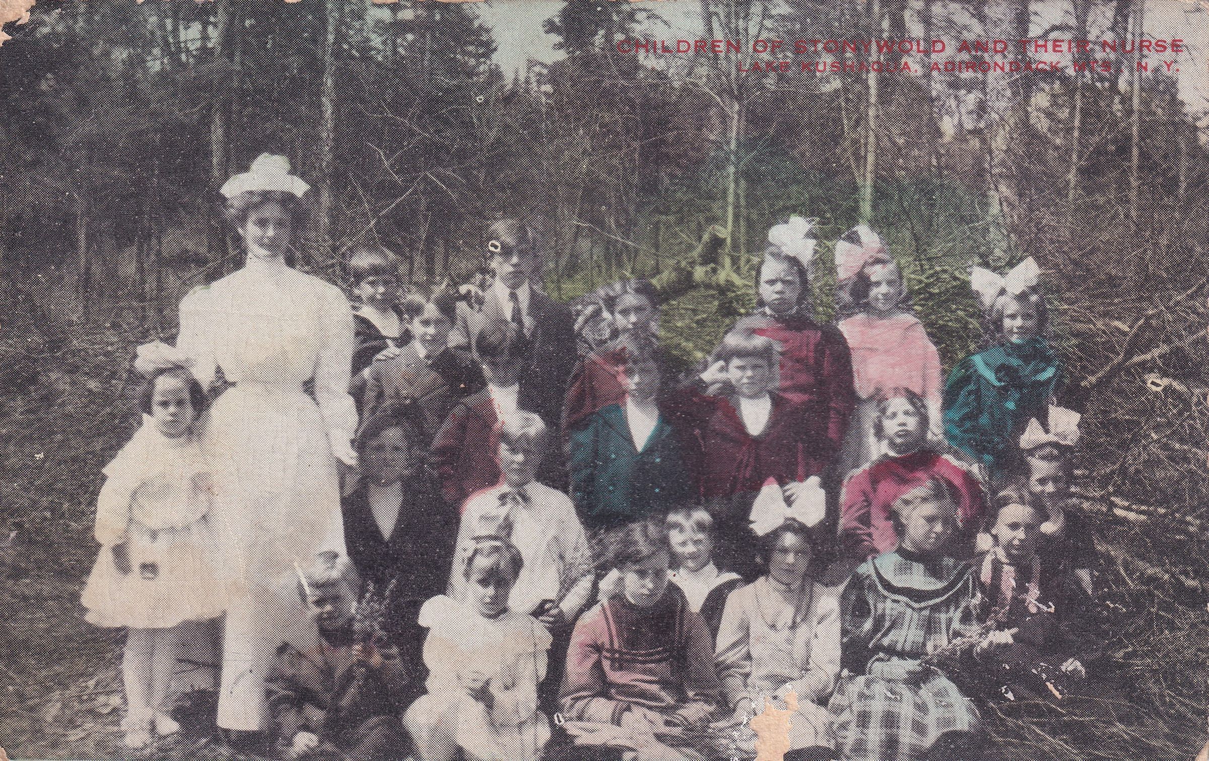 Colored postcard showing a group of children standing outdoors with a nurse. Printed caption on front reads, "Children of Stony Wold and the Nurse, Lake Kushaqua, Adirondack Mts., NY." No printer's mark. Used, divided back, not mailed. Handwritten message on back reads, "My Darling Nancy, I am sending you a card of some of the little girls that are here. I hope your dress fitted you. Dad tells me you are very happy. Please write to your mamma soon. Fondest love from Mom. xxxxxxx"Subject Place