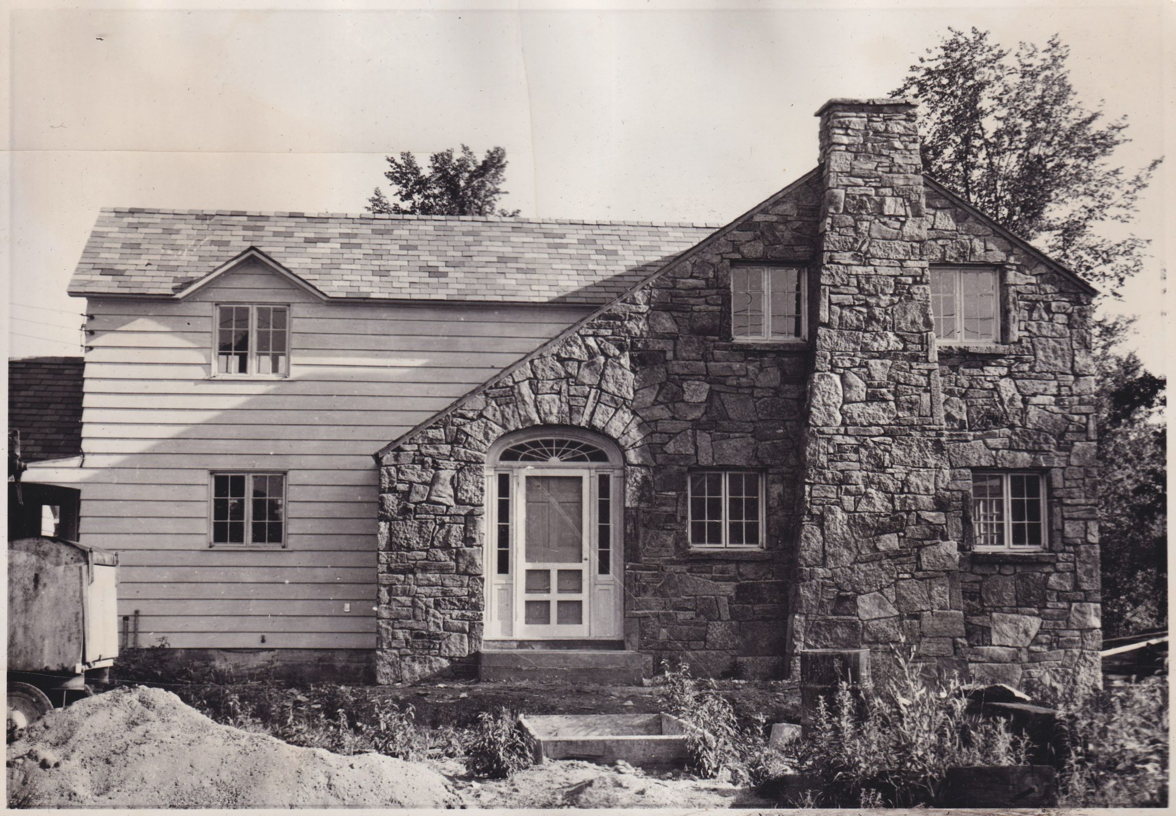 Black-and-White photograph of an unidentified house with a partially stone facade.