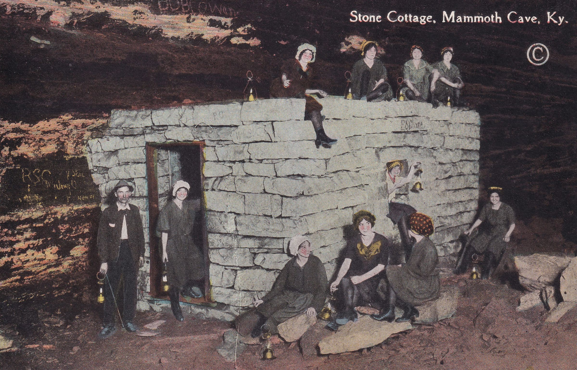 Color postcard showing a group of women and one man standing around and seated on a small stone building inside a cave. These structures were used to house tuberculosis patients inside Mammoth Cave in the 1830s. Printed caption on front reads, "Stone Cottage, Mammoth Cave, Ky." Printed by the Kyle Co., Louisville, KY. Unused, divided back.Lexicon