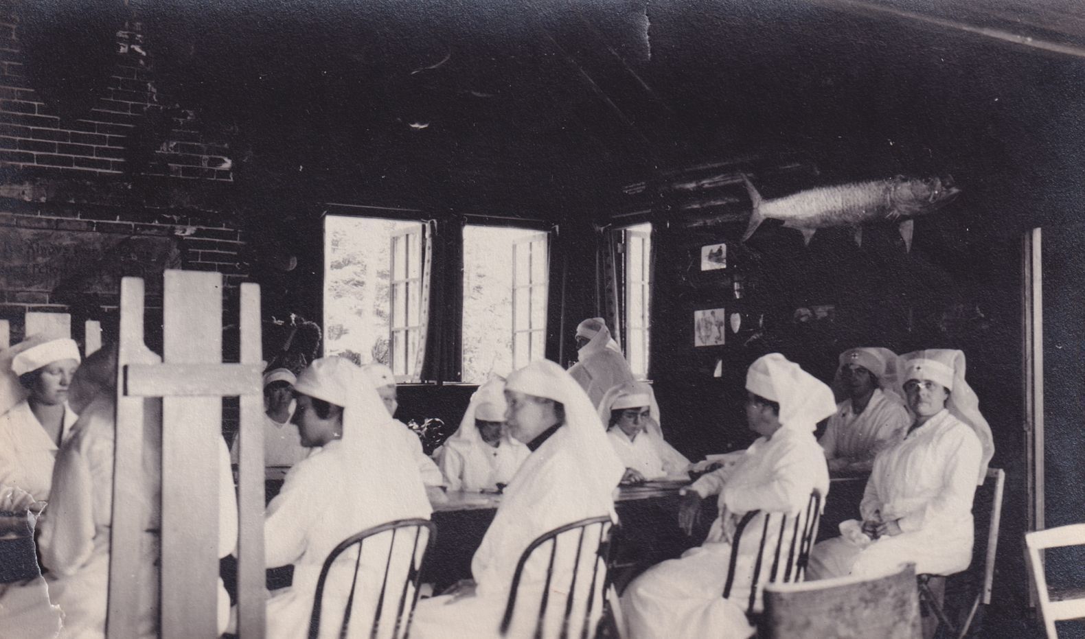 Black and white photograph of many women sitting around a long table inside. They are all wearing white dresses with white caps with long tails on their heads. There is a taxidermied fish on the wall.