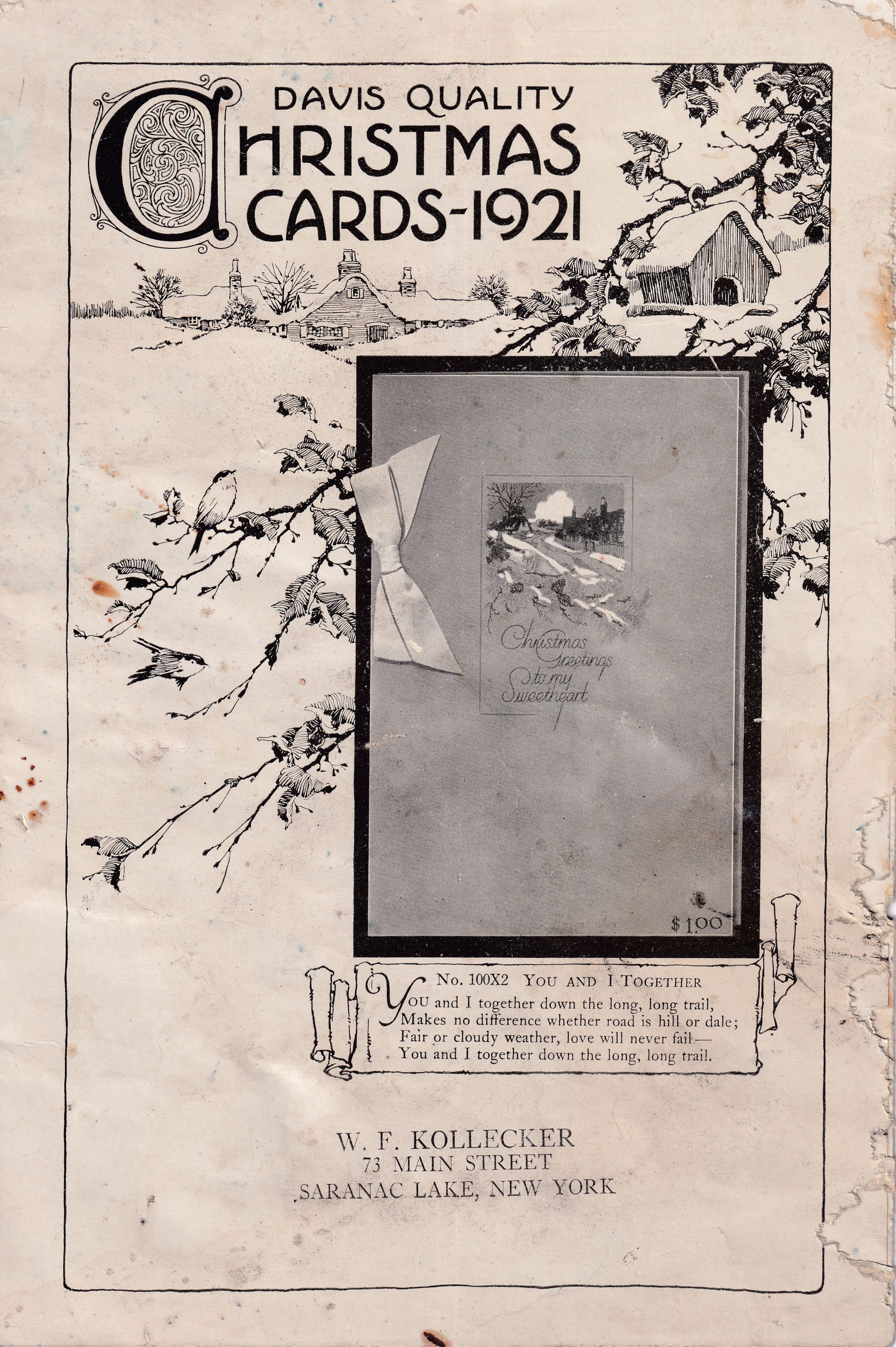 Pamphlet advertising Davis Quality Christmas cards for sale, 1921. Stamped on front cover, "W. F. Kollecker, 73 Main Street, Saranac Lake, New York." Has seven pages of card designs and descriptions along with a blank order form.
