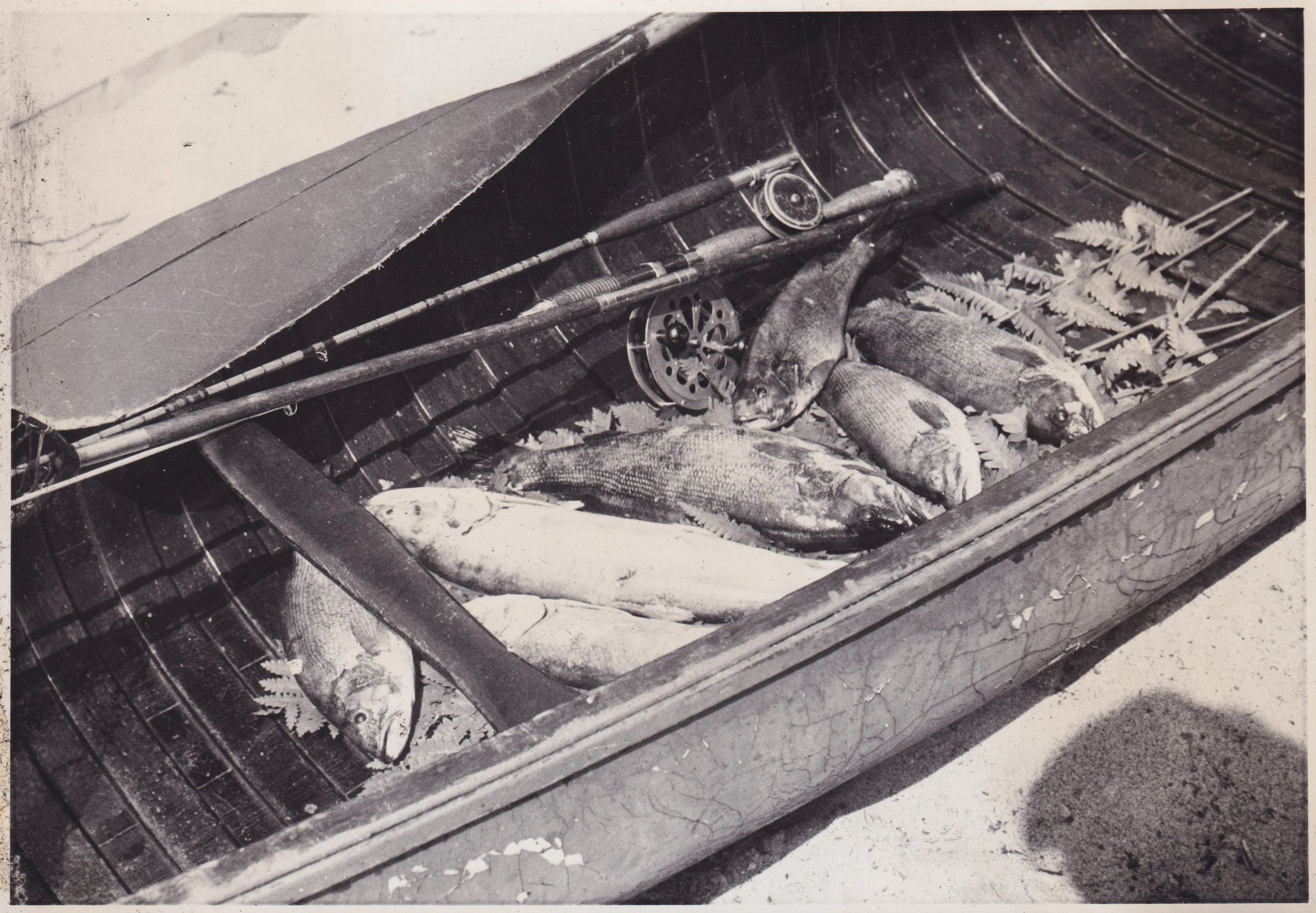 Black-and-White photograph of a group of dead fish in the bottom of a boat. There are fishing rods and an oar alongside them.