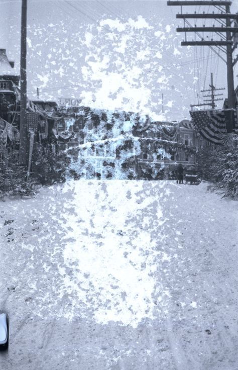 Negative of Broadway looking toward its intersection with Main Street. The street is covered in snow and American flag bunting is hanging over the sidewalks, decorations for Winter Carnival. Thin bits of paper are stuck to the surface of the negative, partially obscuring the image. Most likely taken by Mary Ives Baldwin. This item is not fully cataloged but has been uploaded so the image is publicly available; if you would like us to prioritize cataloging this item, please contact the HSL Collections team.