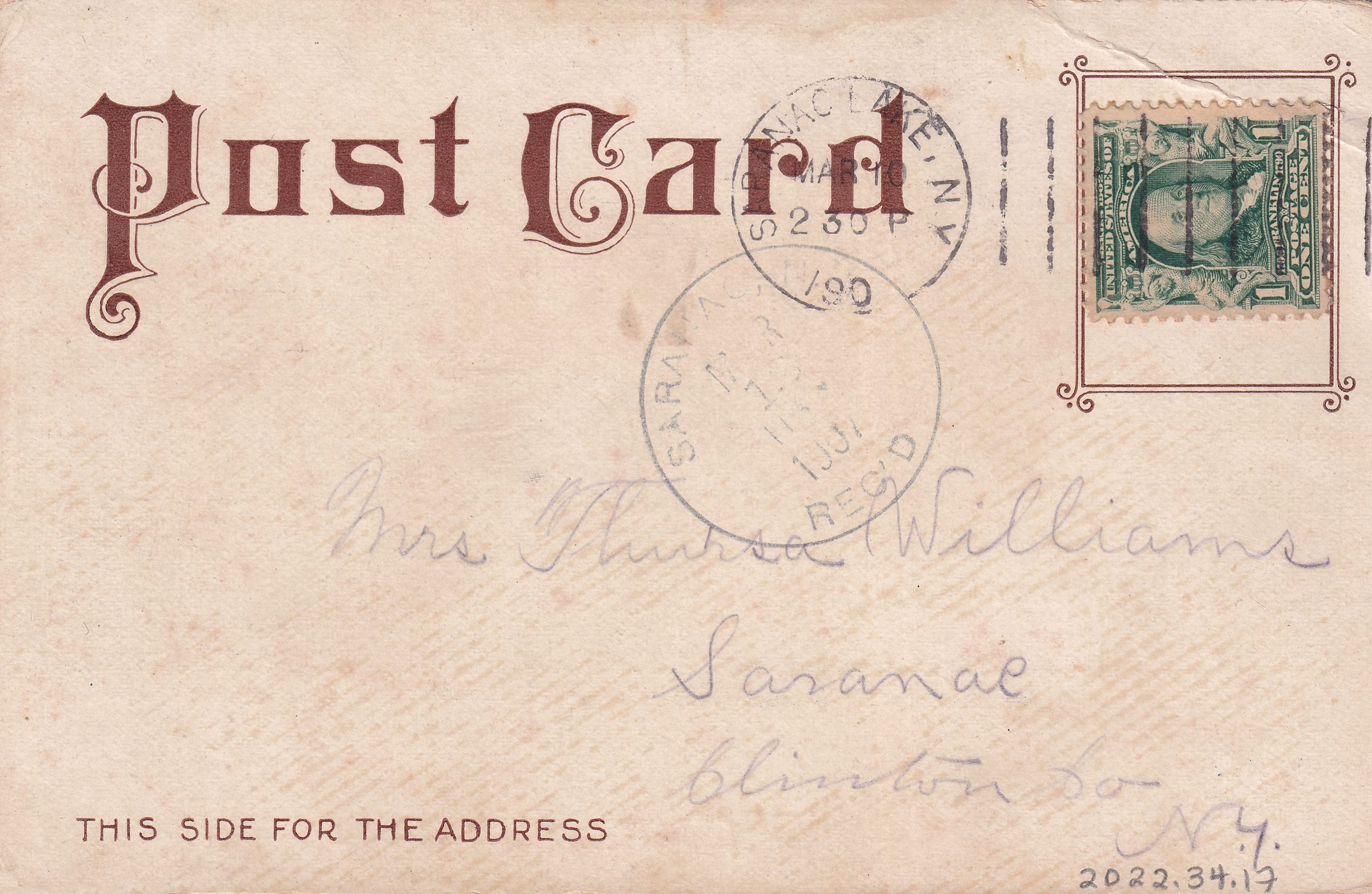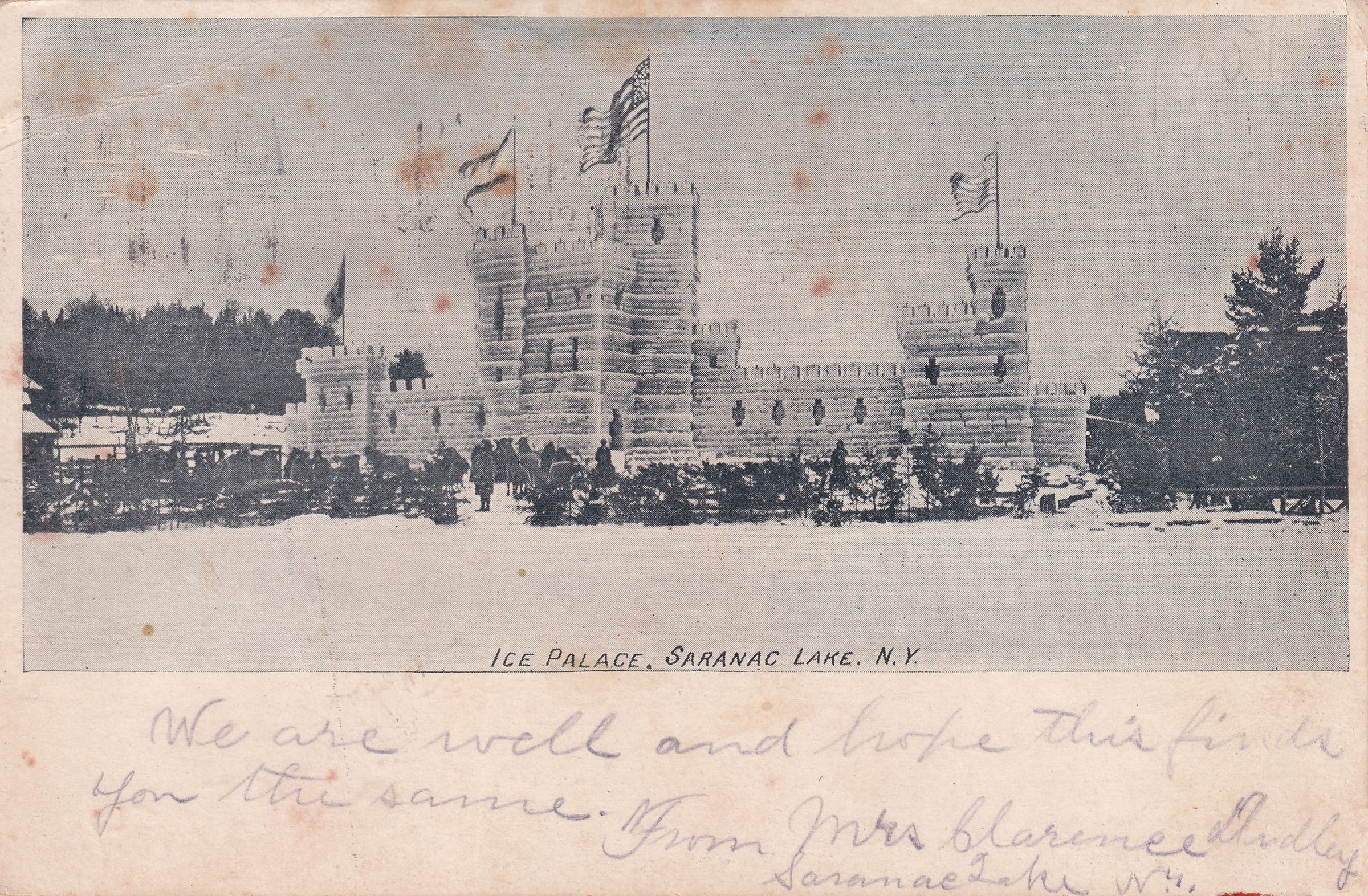 Black-and-white postcard showing the Ice Palace, from an unidentified Winter Carnival (likely 1907). Printed caption on front reads, "Ice Palace, Saranac Lake, N.Y." No printer's mark. Used, undivided back, white border and bottom text box on front, postmarked Saranac Lake, March 10, 1907. Handwritten message on front reads, "We are well and hope this finds you the same. Fram Mrs. Clarence Dudley, Saranac Lake, NY." Mailed to Mrs. Theresa Williams, Saranac, Clinton Co., NY.Subject Place