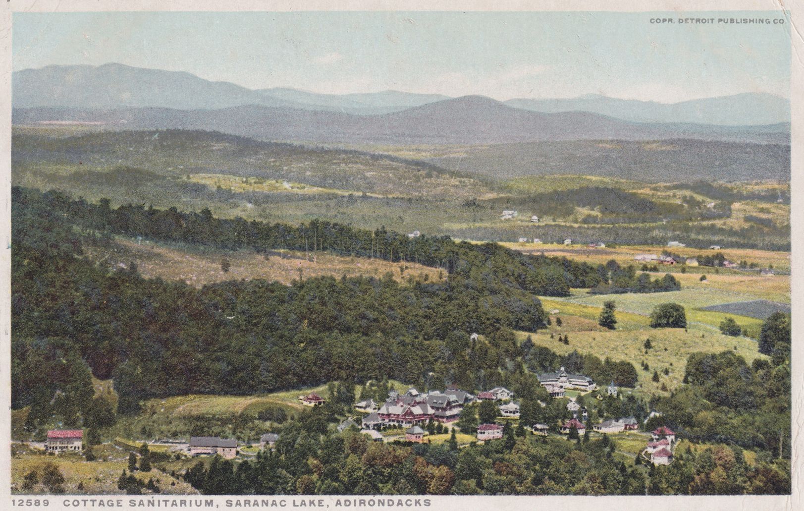 Color postcard showing an aerial view of the Adirondack Cottage Sanitarium [later Trudeau Sanatorium], looking west. Printed caption on front reads, "Cottage Sanitarium, Saranac Lake, Adirondacks." Printed by Detroit Publishing Co. Used, divided back, white border, no postmark.