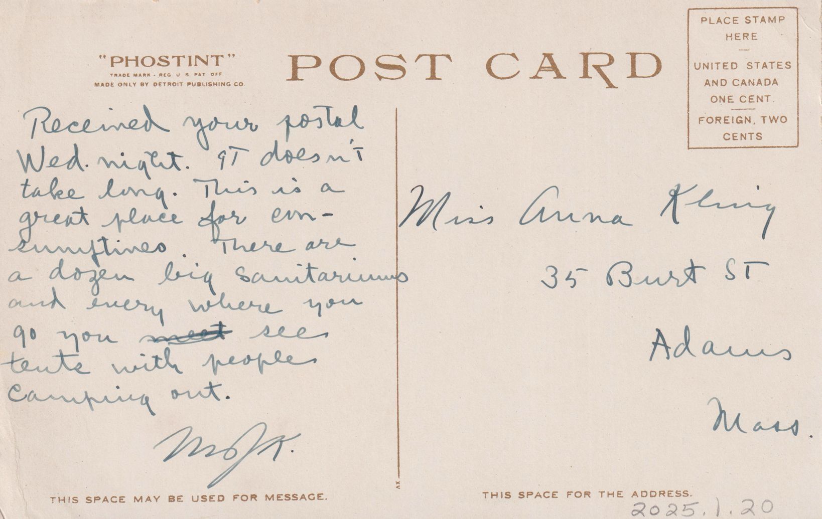 Handwritten message on reverse reads, "Received your postal Wed. night. It doesn't take long. This is a great place for consumptives. There are a dozen tiny sanitariums and every where you go you see tents with people camping out. Mrs. K." Mailed to Miss Anna Kling [?], 35 Burt St., Adams, MA.Subject Place