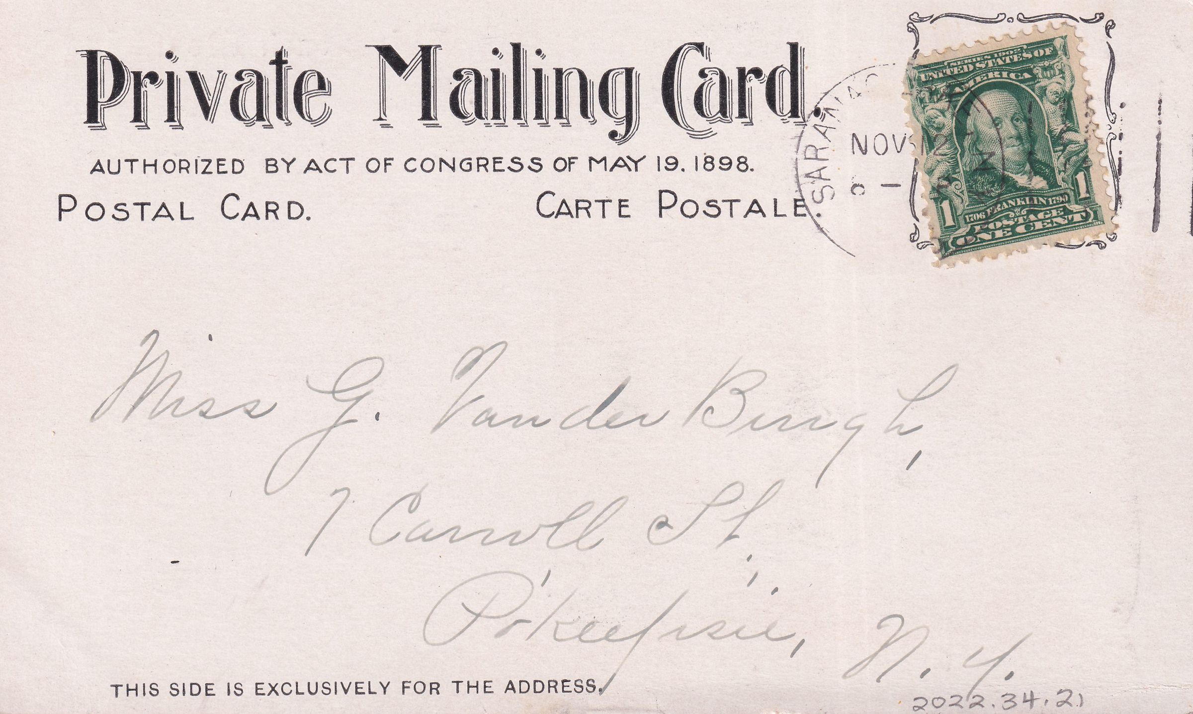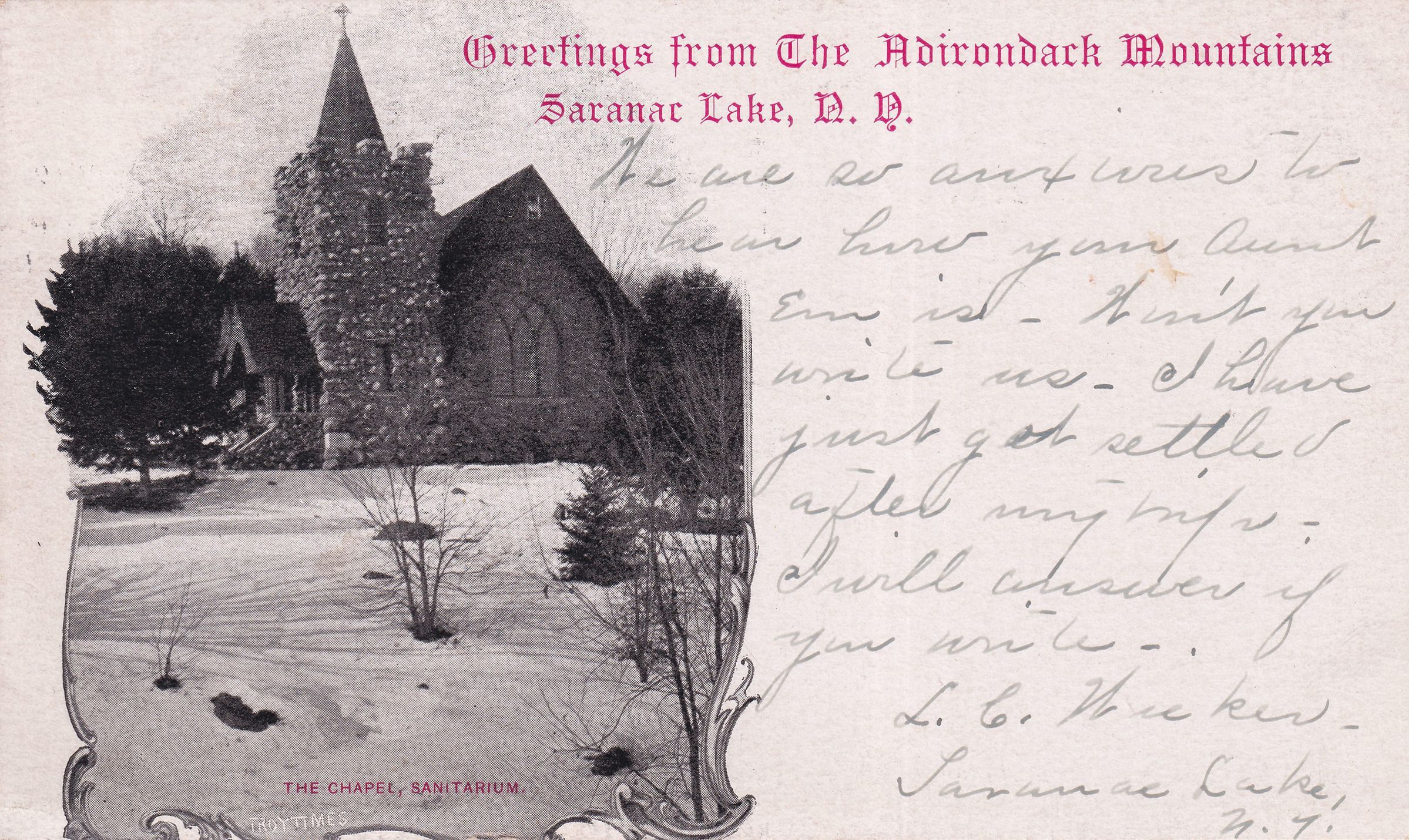 Black-and-white postcard showing a cutout image of Baker Chapel at the Adirondack Cottage Sanitarium (later renamed Trudeau Sanatorium), captioned "the Chapel, Sanitarium." Printed caption at top of card reads, "Greetings from the Adirondack Mountains, Saranac Lake, N.Y." Marked as "Private Mailing Card," with no printer's mark. Used, undivided back, white text area on front, postmarked Saranac Lake, November 12, [?]. Handwritten message on front reads, "We are so anxious to hear how your Aunt Em is. Won't you write us. I have just got settled after my trip. I will answer if you write. L. C. Wicker, Saranac Lake, NY." Mailed to Miss G. Vanderburgh, 7 Carroll St., Po'Keepsie, NY.Subject Place