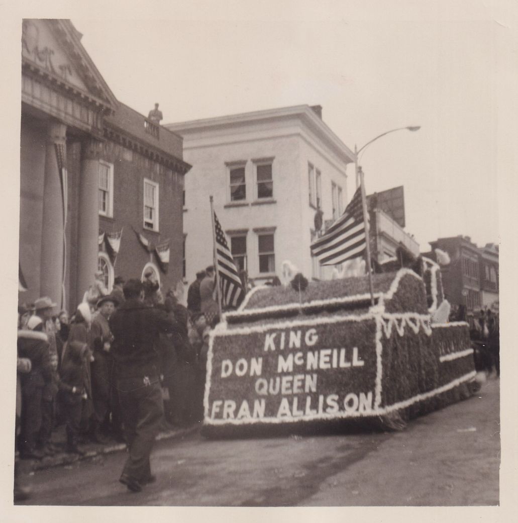 Black-and-White photograph of the royal float in the 1957 Winter Carnival parade on Main Street in front of the Harrietstown Town Hall. The front of the float reads, “King Don McNeill, Queen Fran Allison.” People can be seen lining the sidewalk.