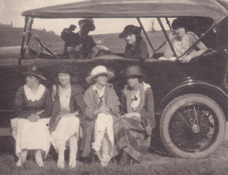 Black and white photograph of four women sitting on the running board of a car. There are two more women inside of the car and one man standing on the other side.