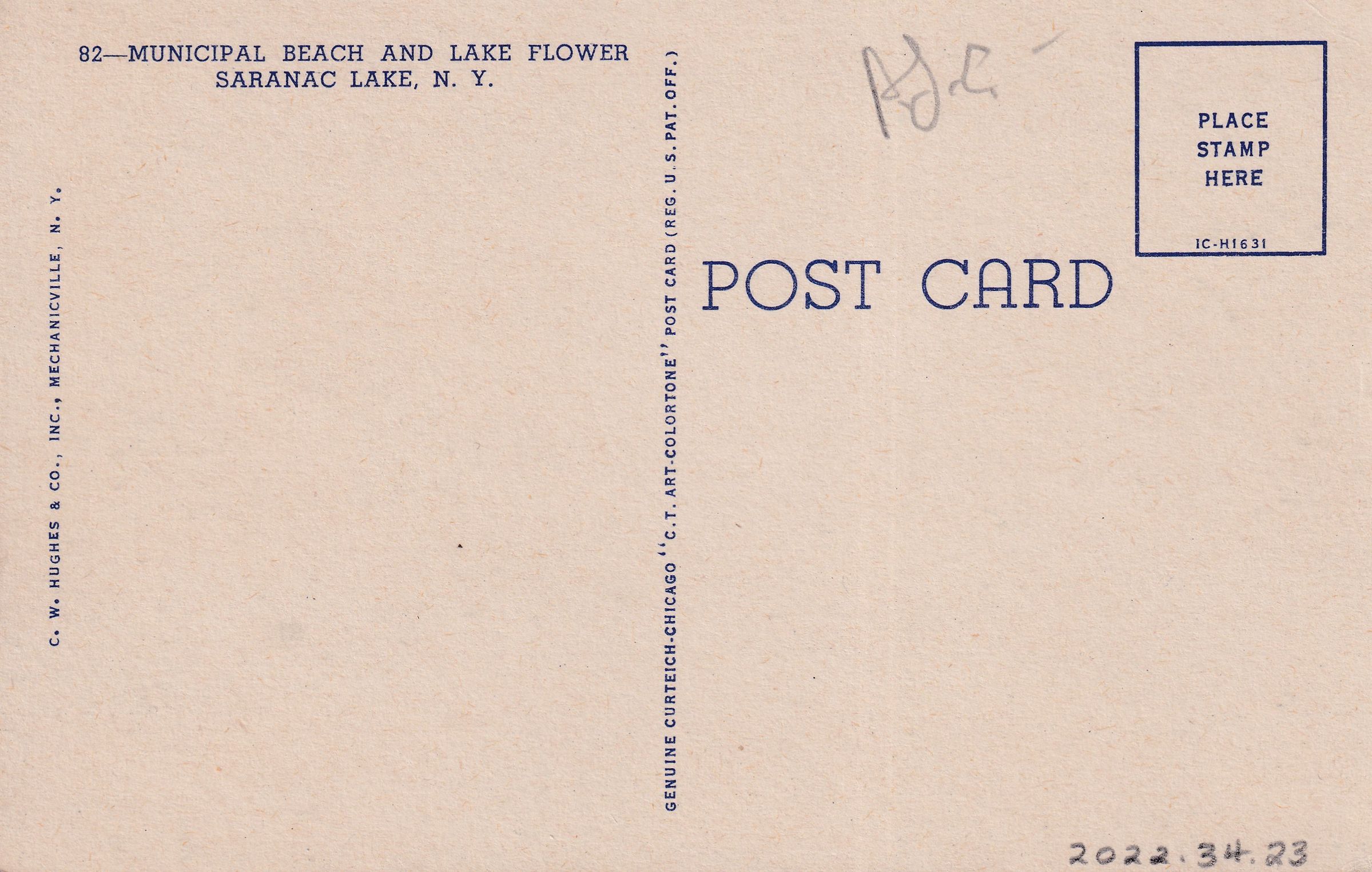 Color linen postcard showing a crowd of people along a swimming beach. Printed caption on back reads, "Municipal Beach and Lake Flower, Saranac Lake, N.Y." Printed by C. W. Hughes & Co., Inc., Mechanicville, NY. Unused, divided back.Subject Place