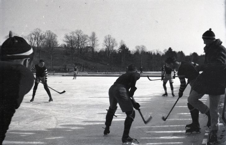 Negative of a group of young men playing hockey on an outdoor rink. Half of the group is wearing striped sleeves while the other half has solid sleeves. Most likely taken by Mary Ives Baldwin. This item is not fully cataloged but has been uploaded so the image is publicly available; if you would like us to prioritize cataloging this item, please contact the HSL Collections team.