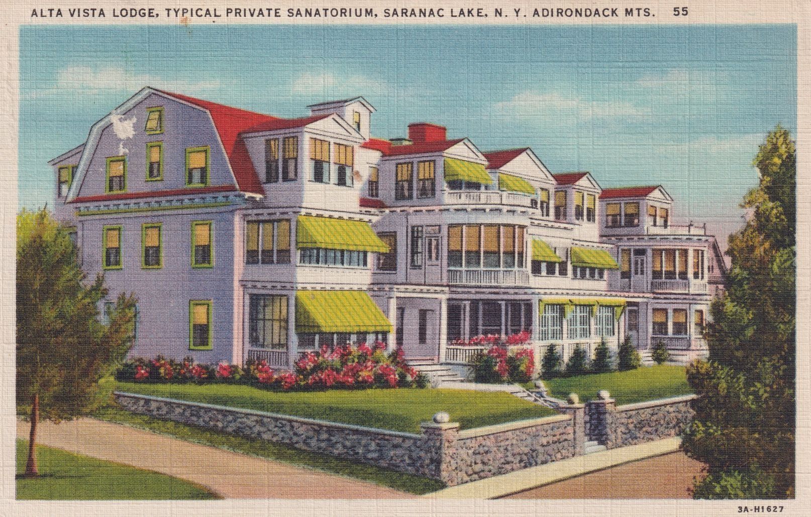 Color linen postcard showing the Alta Vista Lodge. Printed caption on front reads, "Alta Vista Lodge, Typical Private Sanatorium, Saranac Lake, N. Y. Adirondack Mts." Printed by C. W. Hughes & Co., Inc., Mechnicville, NY. Used, divided back, white border, postmarked Bald Mountain, NY, August 23, 1934.